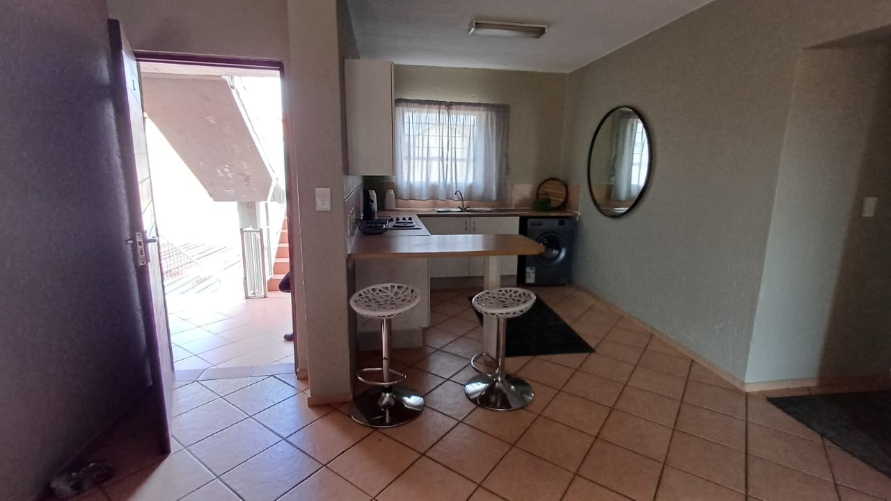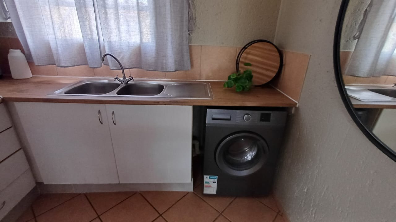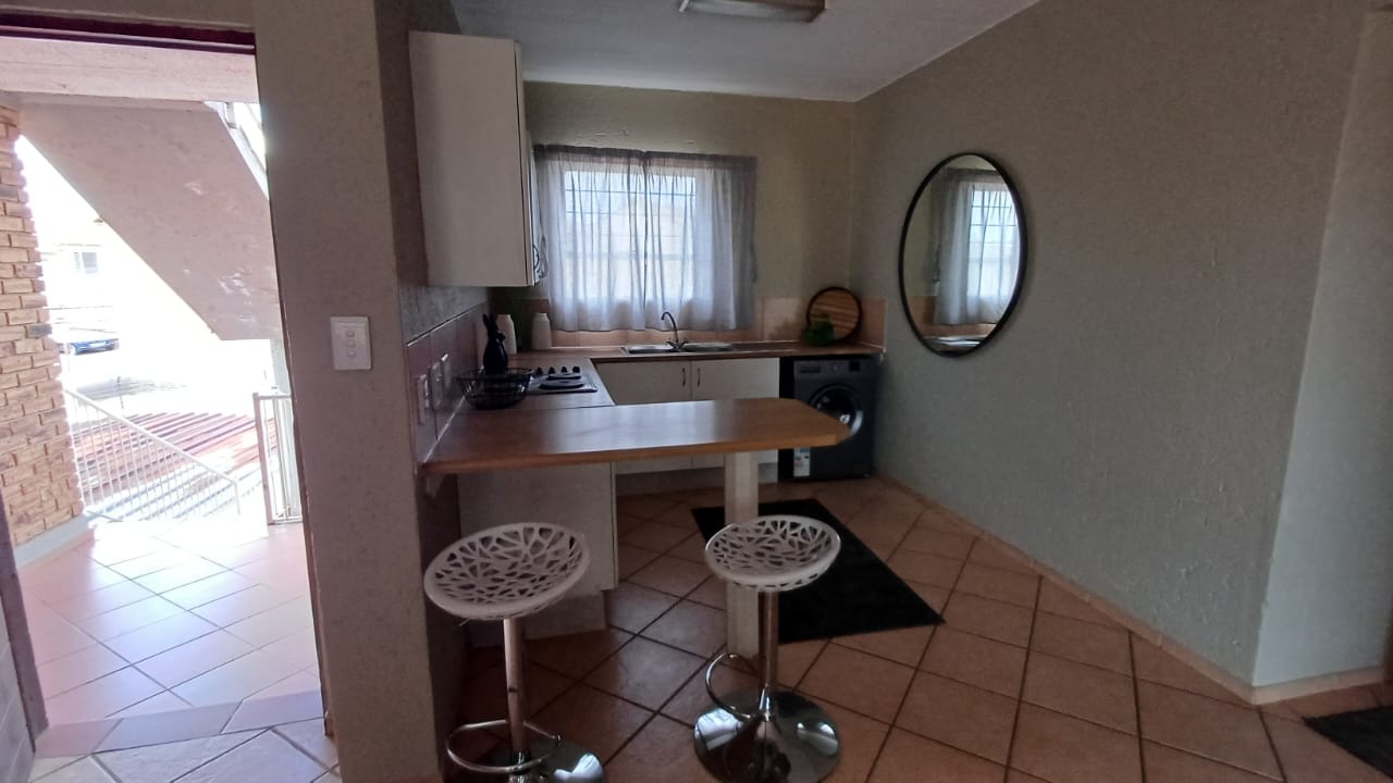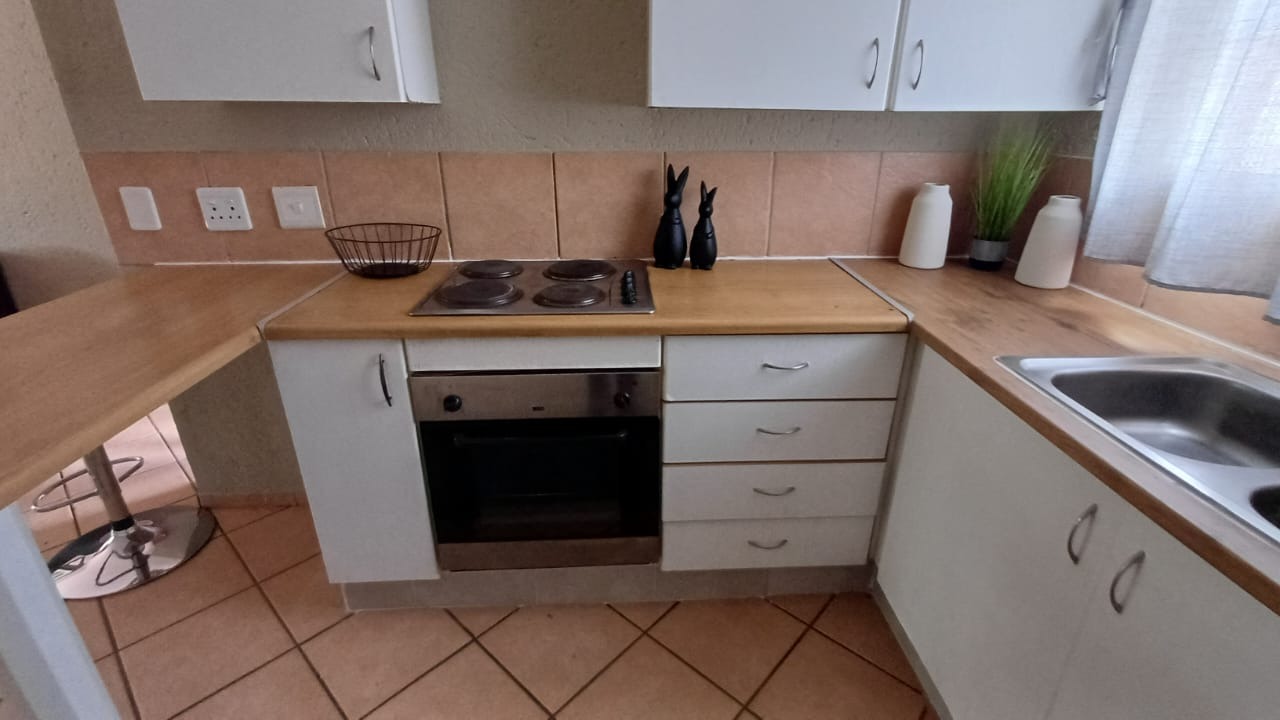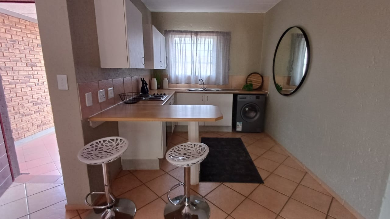 Discover this functional 72 sqm apartment located in a secure complex within the metropolitan and suburban area of Roodepoort. The interior features a well-designed, compact U-shaped kitchen equipped with light cabinetry, an integrated space for washing machine, a built-in stove and oven, and a double sink. A practical breakfast bar extends the counter space, complemented by tiled flooring and ample natural light from a window. The open-plan layout seamlessly connects the kitchen to a comfortable lounge area, ideal for everyday living.
