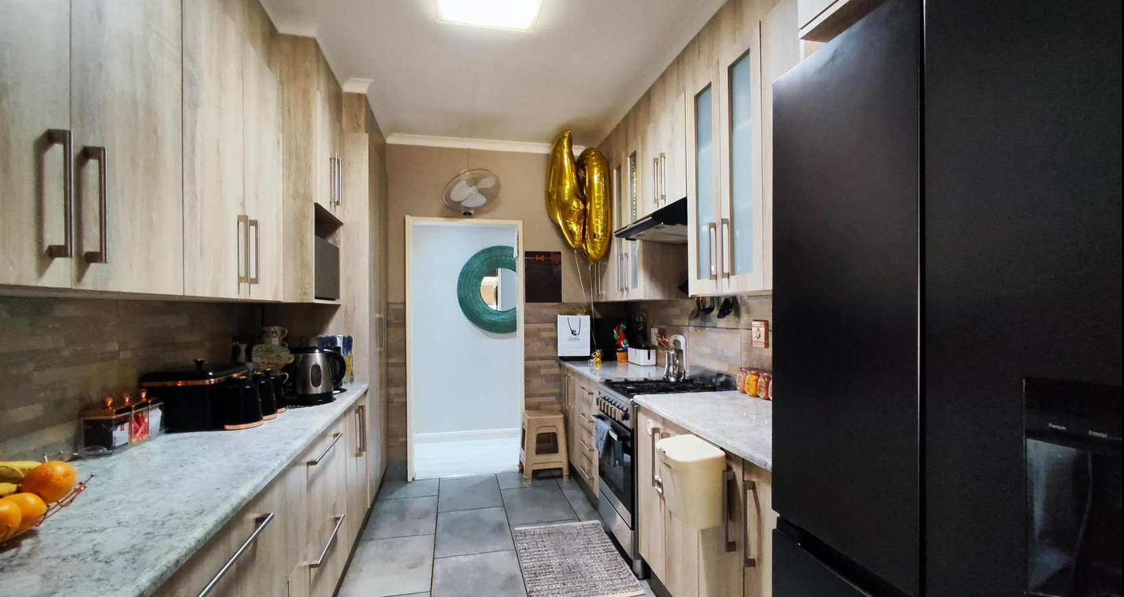 The heart of the home, the kitchen, is a functional and stylish galley design. It features modern light wood-grain cabinetry that provides abundant storage, complemented by sleek marble-look countertops and a tiled backsplash. Equipped with an integrated gas hob and oven, along with dedicated space for a microwave and a large refrigerator, this kitchen is designed for culinary efficiency. A convenient pantry further enhances storage capabilities, making meal preparation a breeze. The adjacent dining room offers a dedicated space for family meals and entertaining guests.