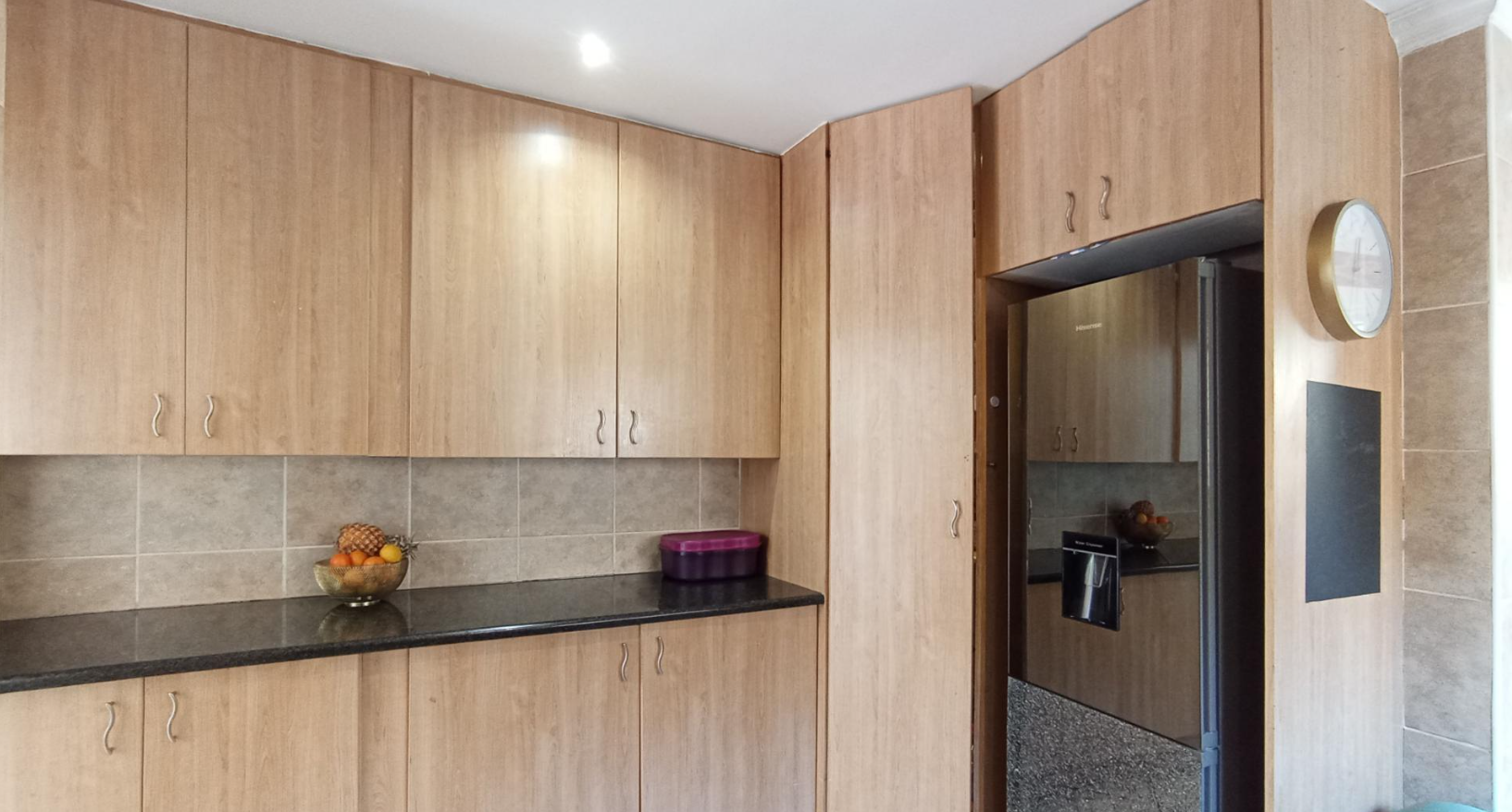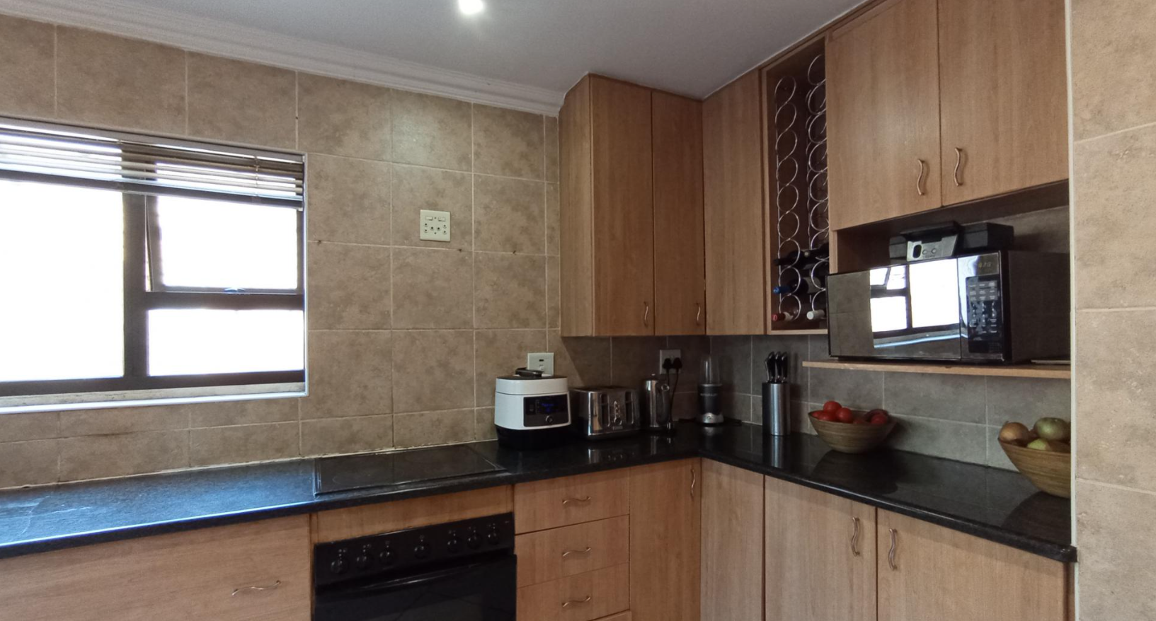The well-appointed kitchen is designed for functionality, featuring extensive light wood-grain cabinetry, dark granite-look countertops, and a neutral tiled backsplash. It comes equipped with a built-in style refrigerator, an integrated oven, a dedicated microwave shelf, and a convenient wine rack, catering to all culinary needs. Adjacent to the kitchen, a practical scullery houses a modern double stainless steel sink, an integrated washing machine, and additional storage, ensuring a tidy and efficient workspace.