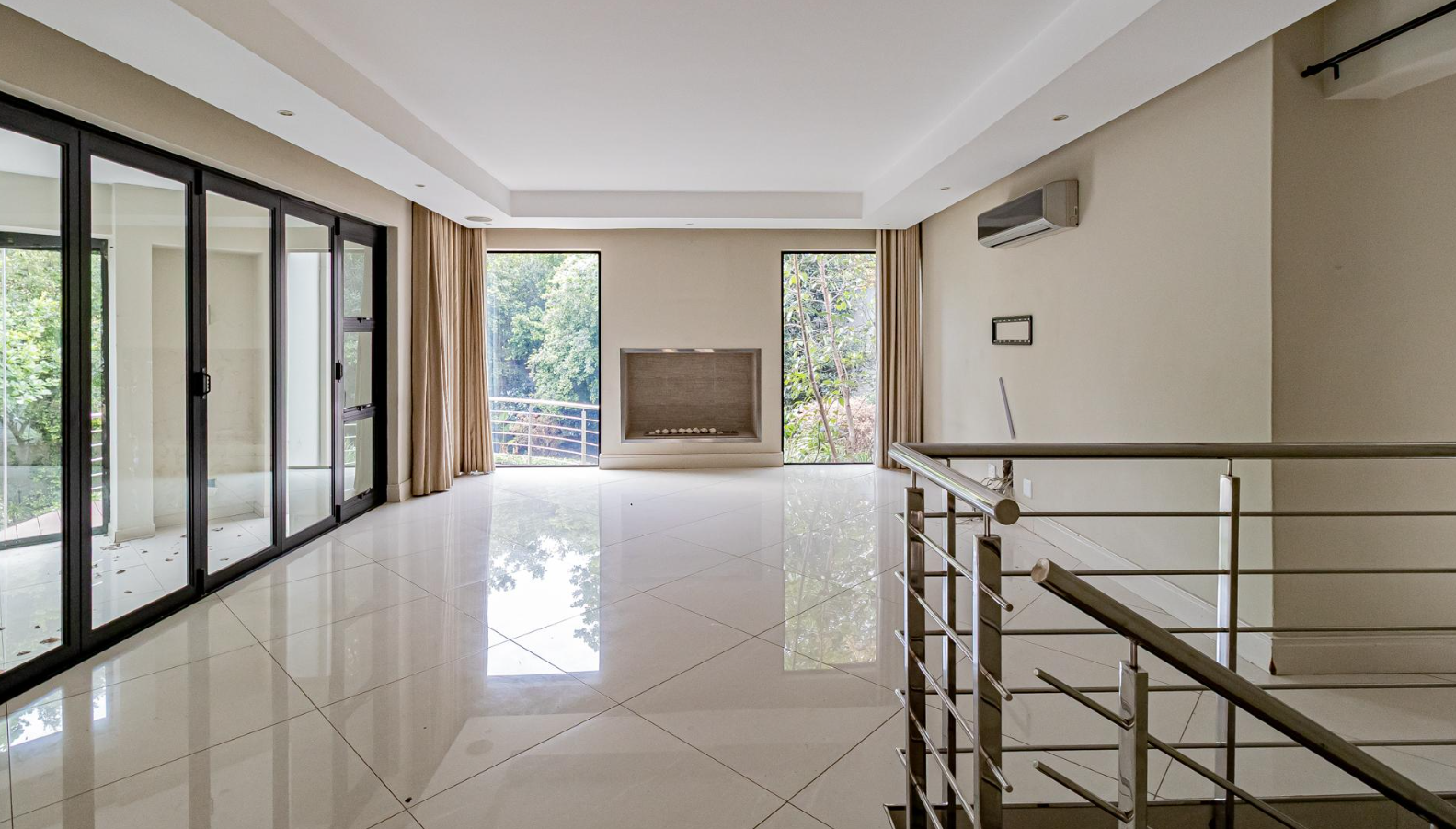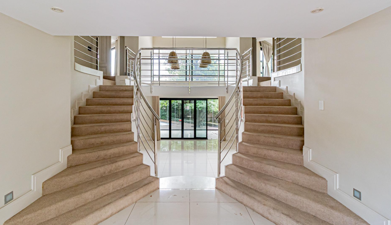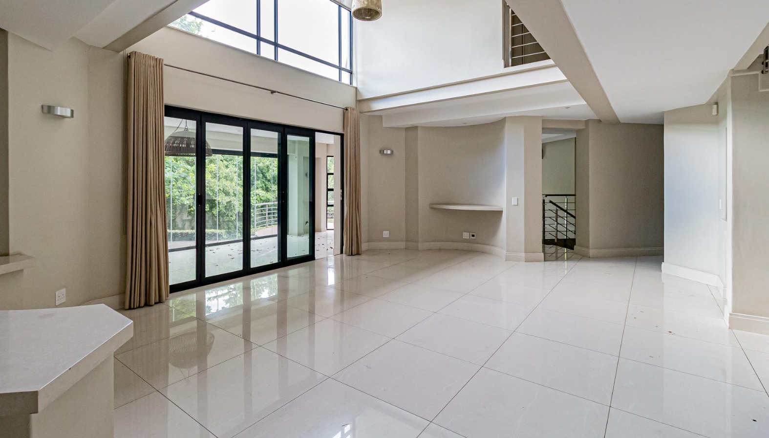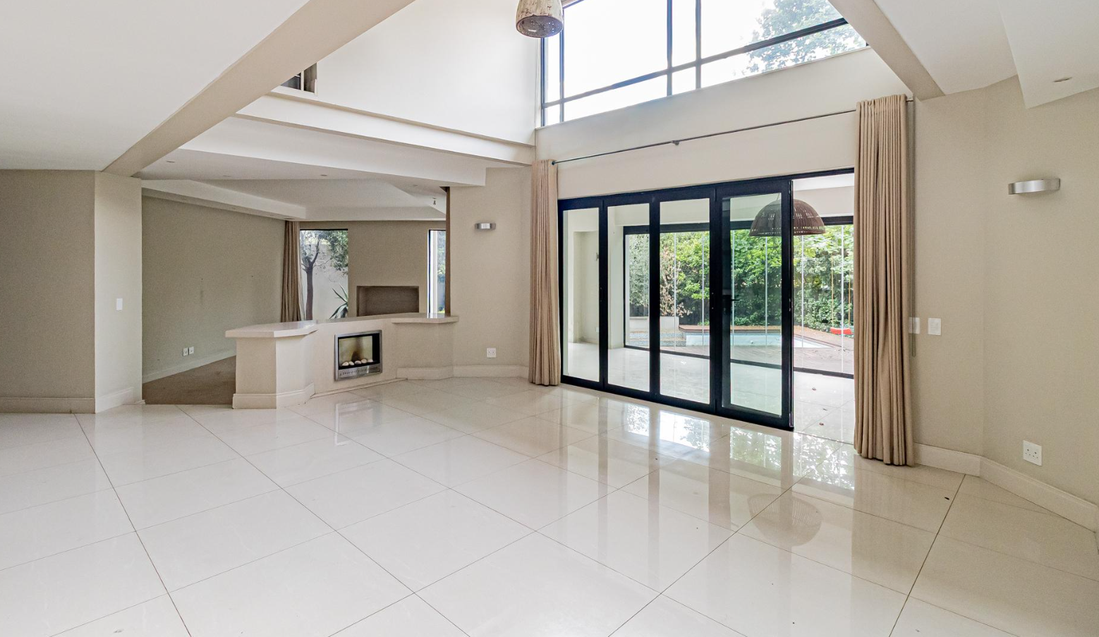 Step inside to an expansive, light-filled interior defined by soaring double-volume ceilings and gleaming white tiled floors that flow seamlessly throughout. The grand, symmetrical split staircase, adorned with modern stainless steel railings, creates a dramatic entrance, while large glass walls and sliding doors effortlessly merge indoor luxury with the serene outdoor environment. Multiple open-plan living areas, including two lounges and a family TV room, offer versatile spaces for both intimate gatherings and grand entertaining, enhanced by a sophisticated built-in bar and a contemporary fireplace feature.