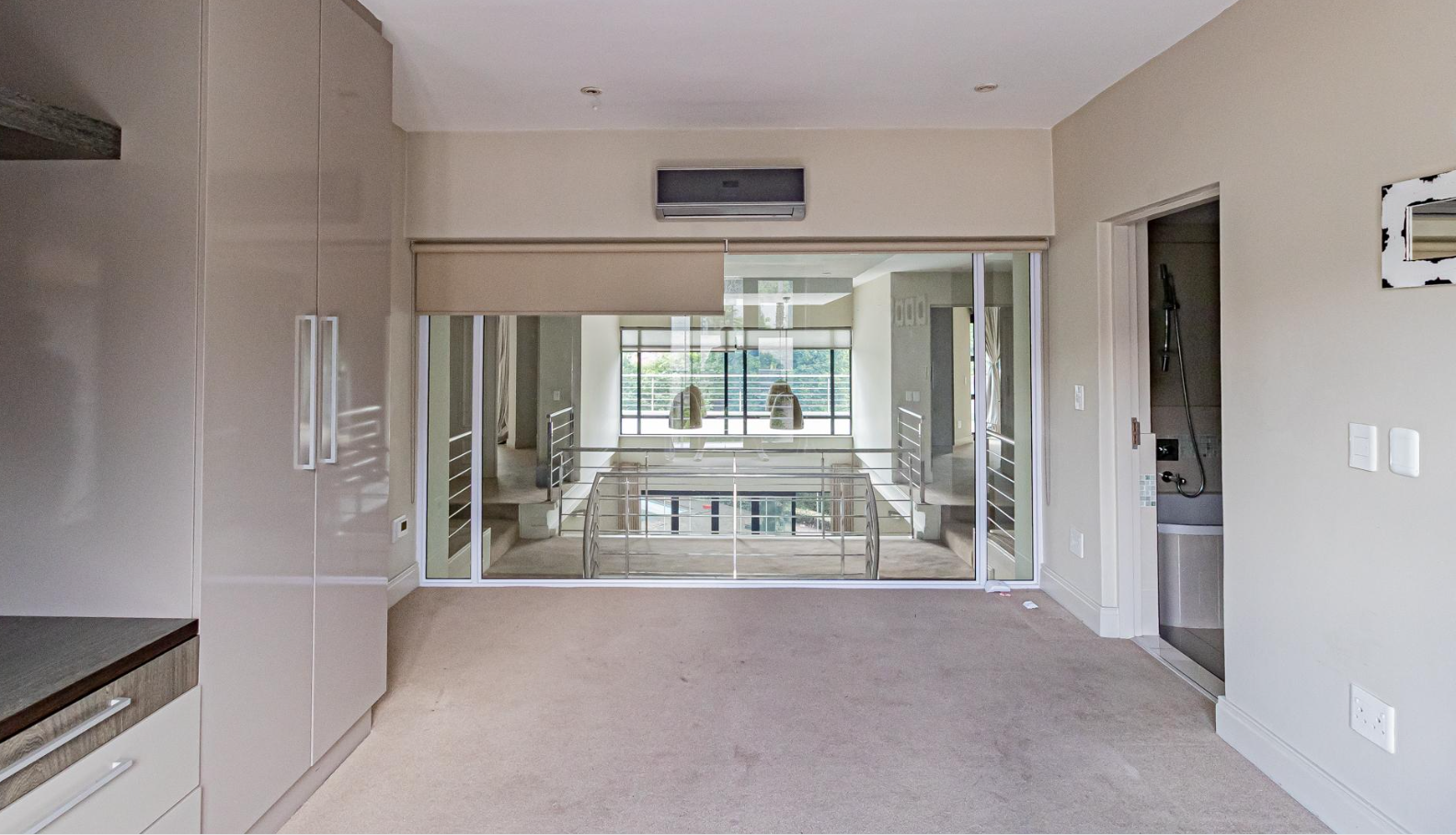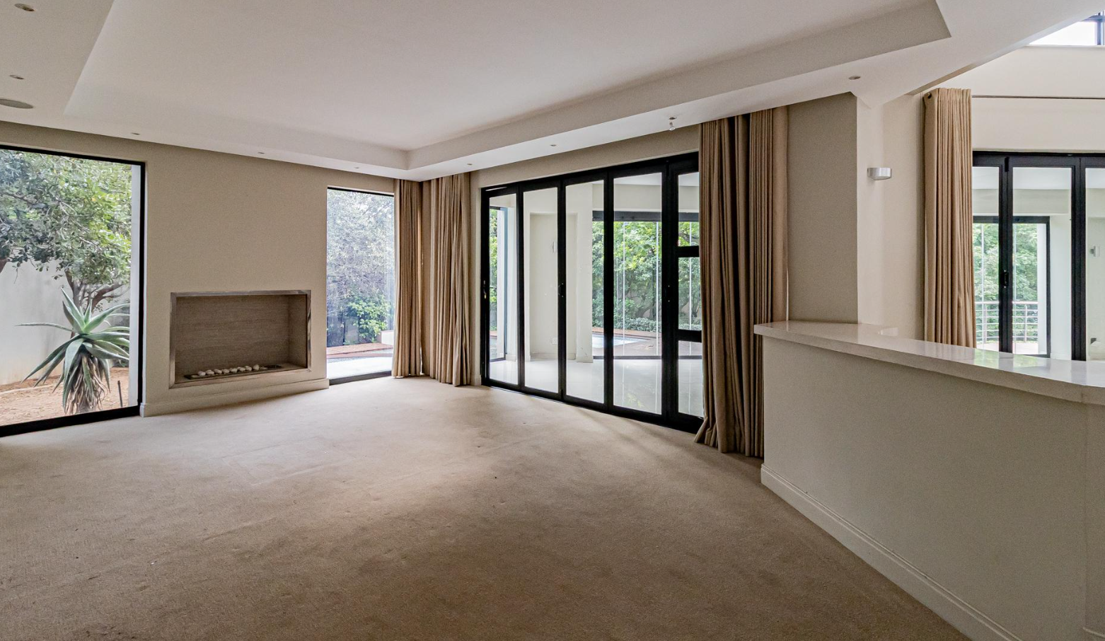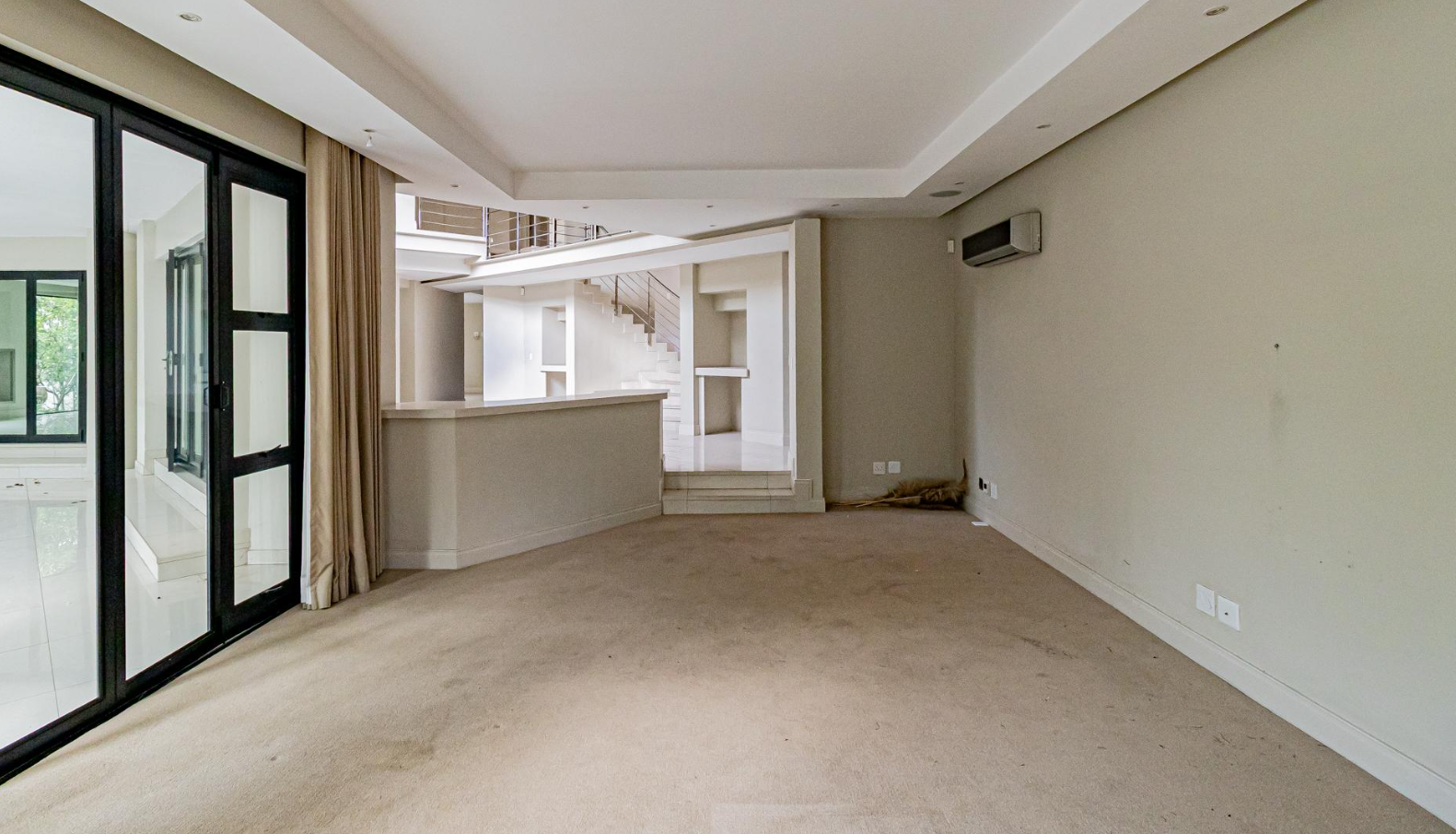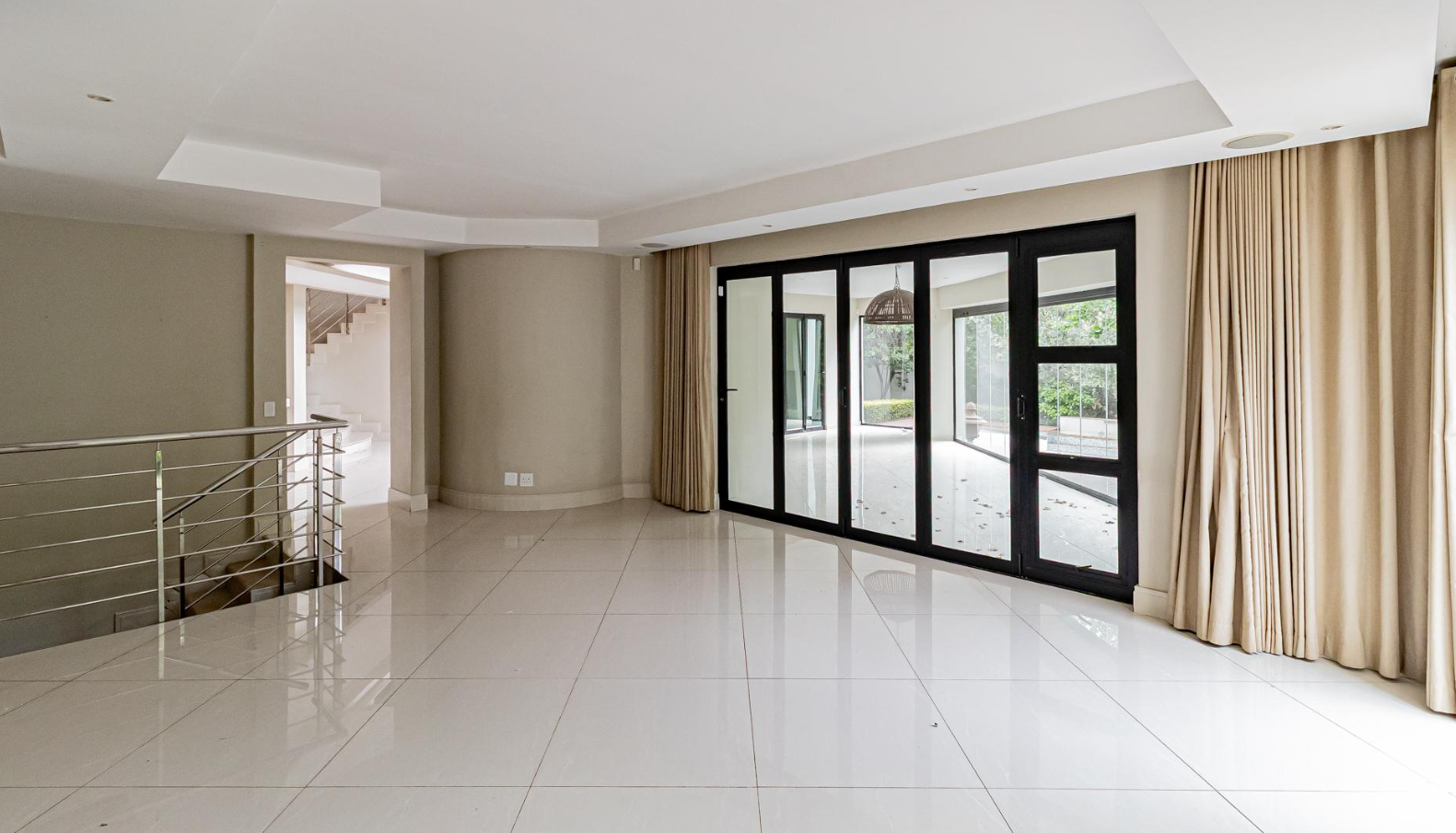 Step inside to an expansive, light-filled interior defined by soaring double-volume ceilings and gleaming white tiled floors that flow seamlessly throughout. The grand, symmetrical split staircase, adorned with modern stainless steel railings, creates a dramatic entrance, while large glass walls and sliding doors effortlessly merge indoor luxury with the serene outdoor environment. Multiple open-plan living areas, including two lounges and a family TV room, offer versatile spaces for both intimate gatherings and grand entertaining, enhanced by a sophisticated built-in bar and a contemporary fireplace feature.