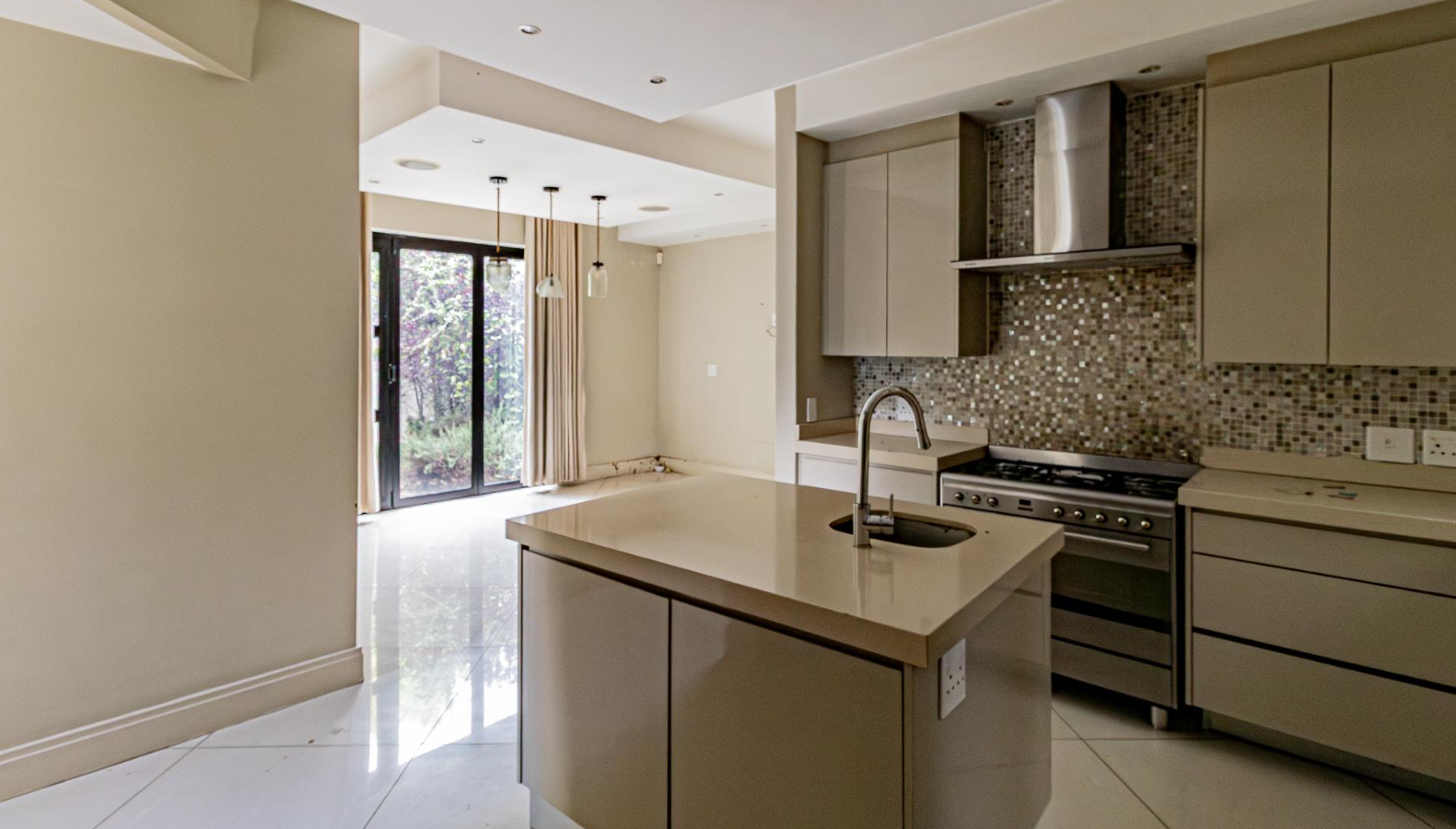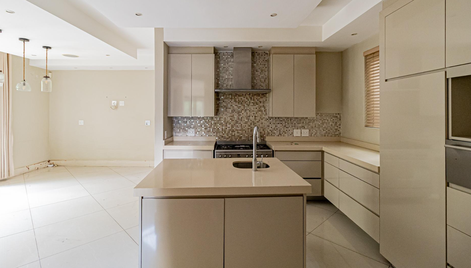 The heart of this home is its state-of-the-art kitchen, a masterpiece of design featuring a central island with an integrated sink, sleek cabinetry, and top-tier stainless steel appliances, including a gas stove. A stylish mosaic tile backsplash adds a touch of refined sophistication, all within an open-plan layout perfect for culinary exploration and social interaction.