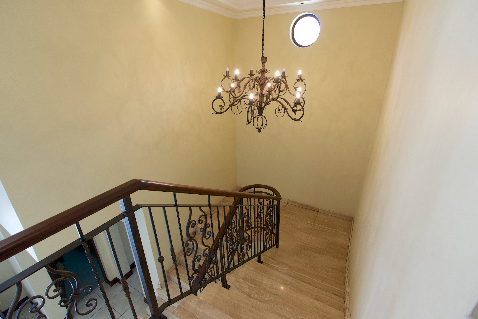 Step inside to a grand double-volume entryway, featuring a sweeping double staircase with ornate wrought iron railings and elegant architectural details like pillars and crown molding. The interior boasts two spacious lounges, a dedicated dining room, and a family TV room, providing ample space for relaxation and entertaining. The heart of the home is a large, open-plan kitchen, equipped with extensive traditional wooden cabinetry, durable granite countertops, and a substantial central island with bar seating. Integrated laundry facilities are also a practical addition.