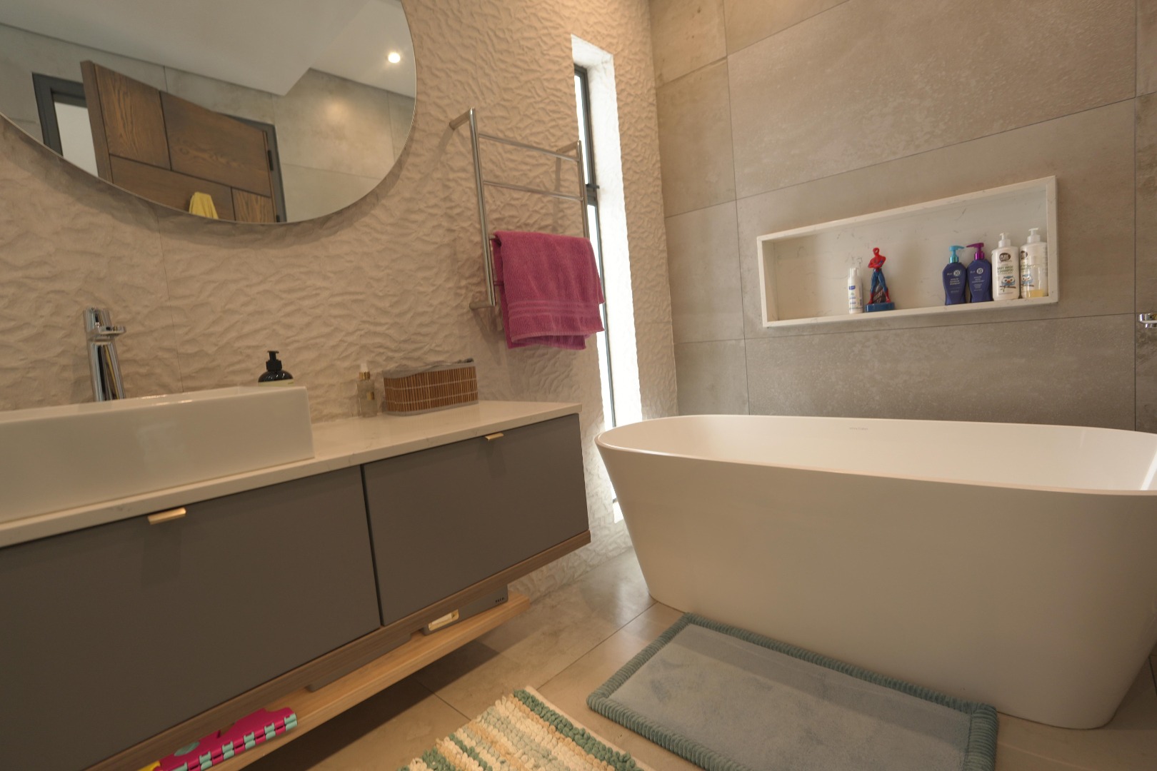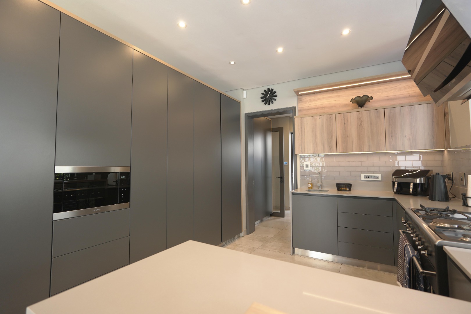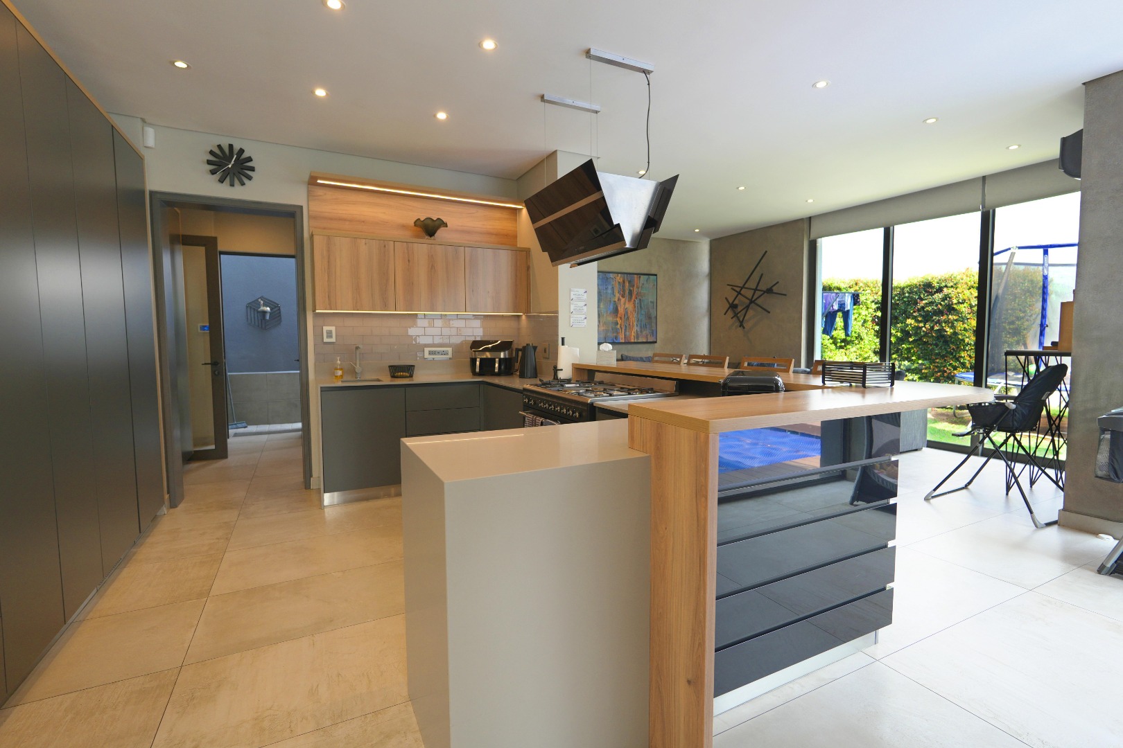 The kitchen is a chef’s delight, complete with state-of-the-art fixtures, top-of-the-line integrated appliances, and an impressive gas stove and hob. There’s also a separate scullery adorned with chic subway tiles, leading to a spacious double garage that offers extra storage and room for two more appliances.