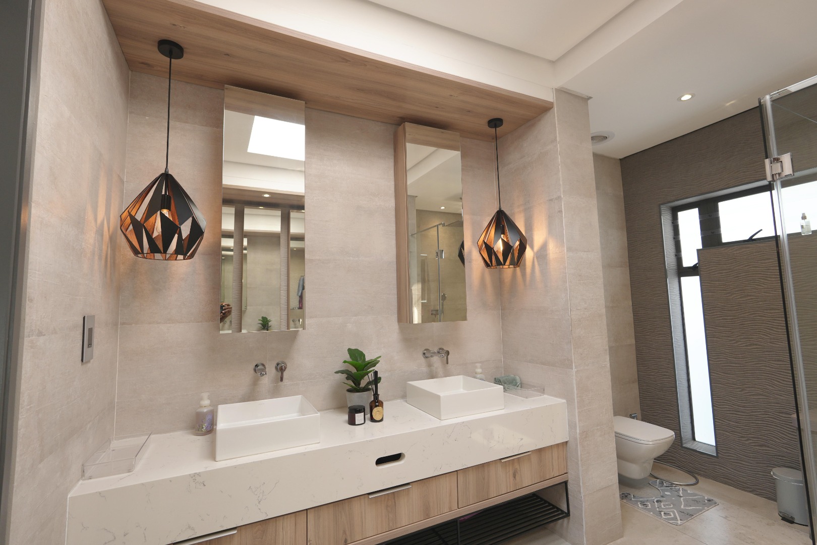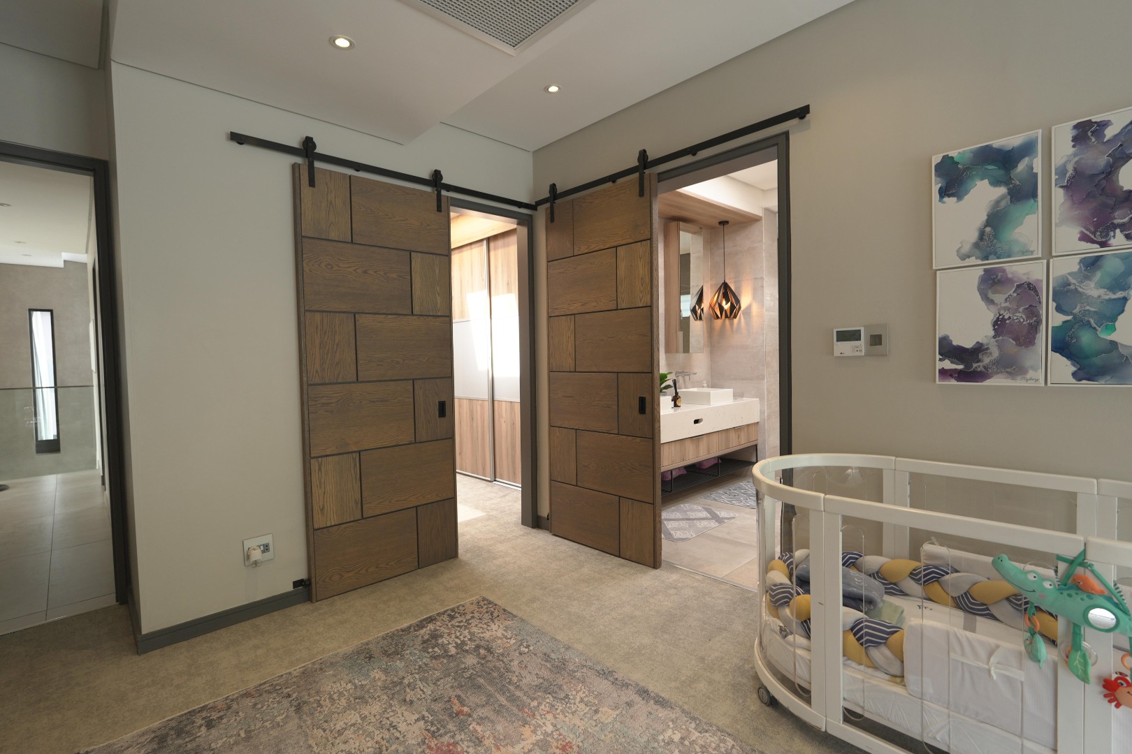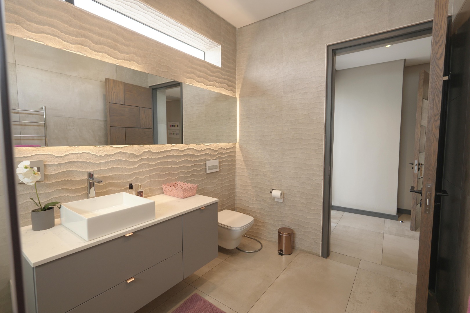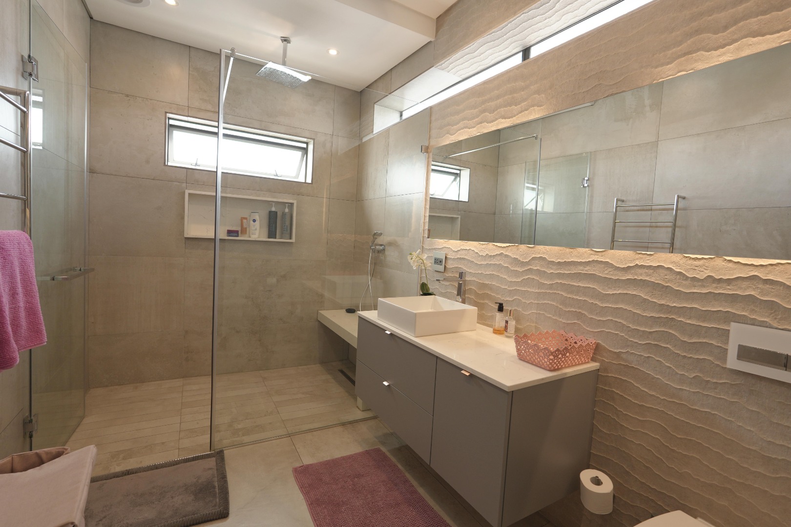 The kitchen is a chef’s delight, complete with state-of-the-art fixtures, top-of-the-line integrated appliances, and an impressive gas stove and hob. There’s also a separate scullery adorned with chic subway tiles, leading to a spacious double garage that offers extra storage and room for two more appliances.