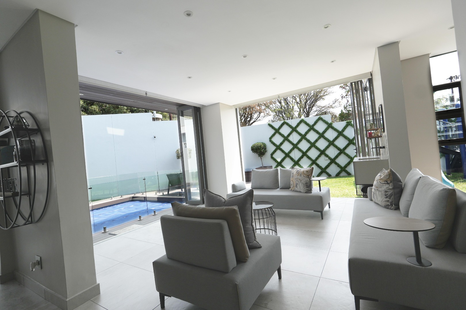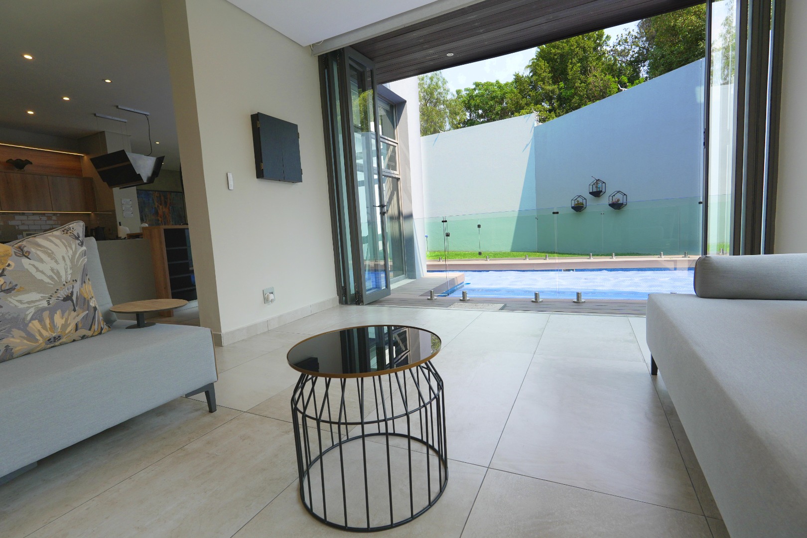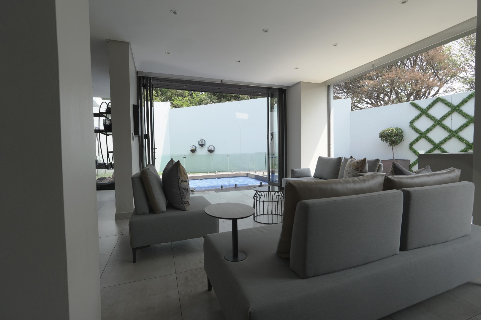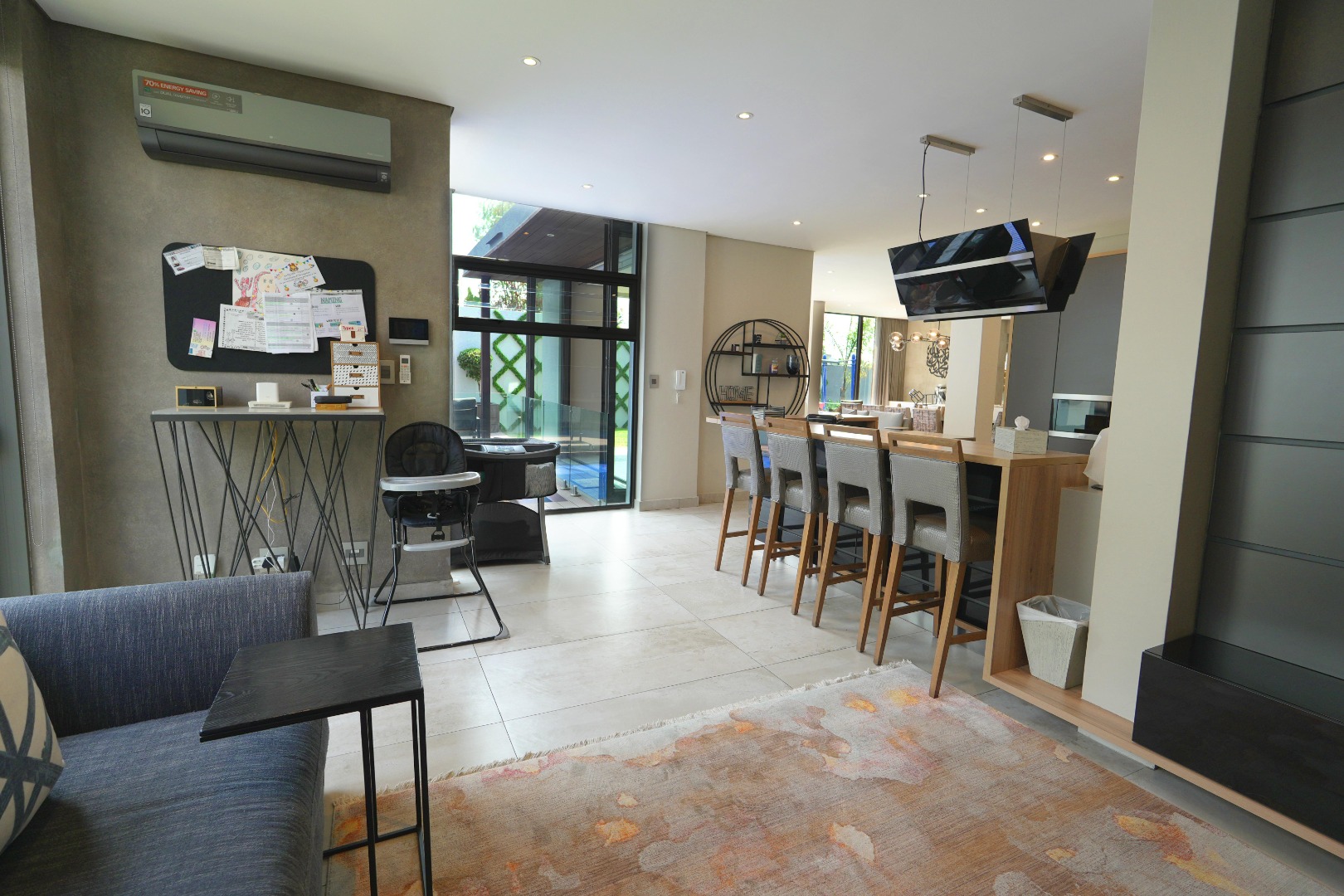 Welcome to your dream home, nestled in a lovely private estate right in the heart of Sandown, Sandton! As you step inside, you'll be captivated by the stunning design and luxurious touches throughout. The dining room features a cozy flueless gas fireplace, creating a warm and inviting atmosphere. You'll love the aluminium stack doors that open up from the living area to reveal a sparkling solar-heated pool and a beautifully manicured garden—perfect for relaxing or entertaining friends!