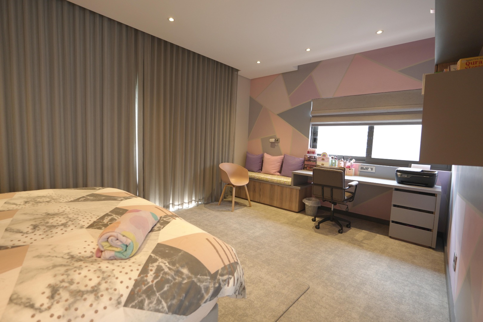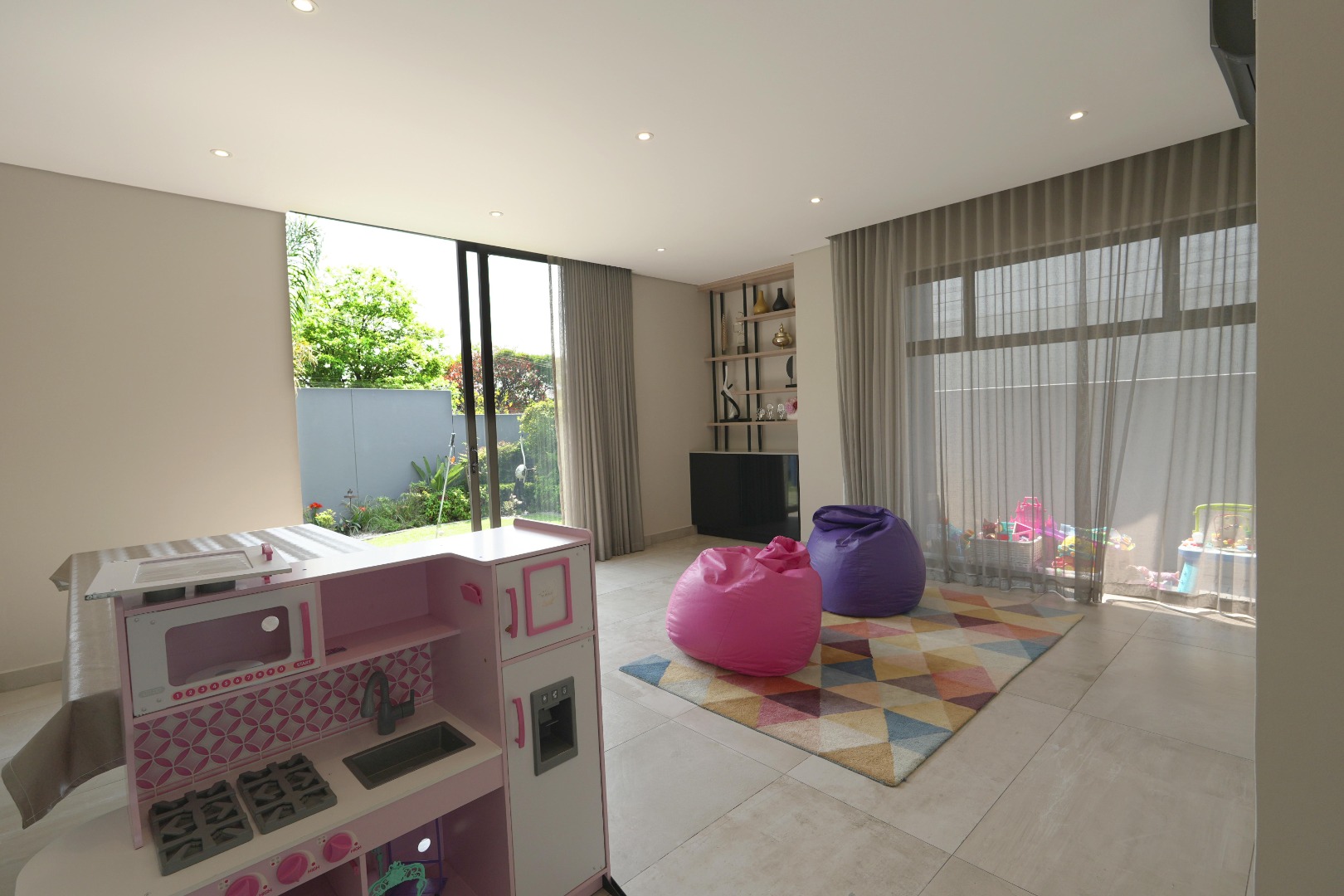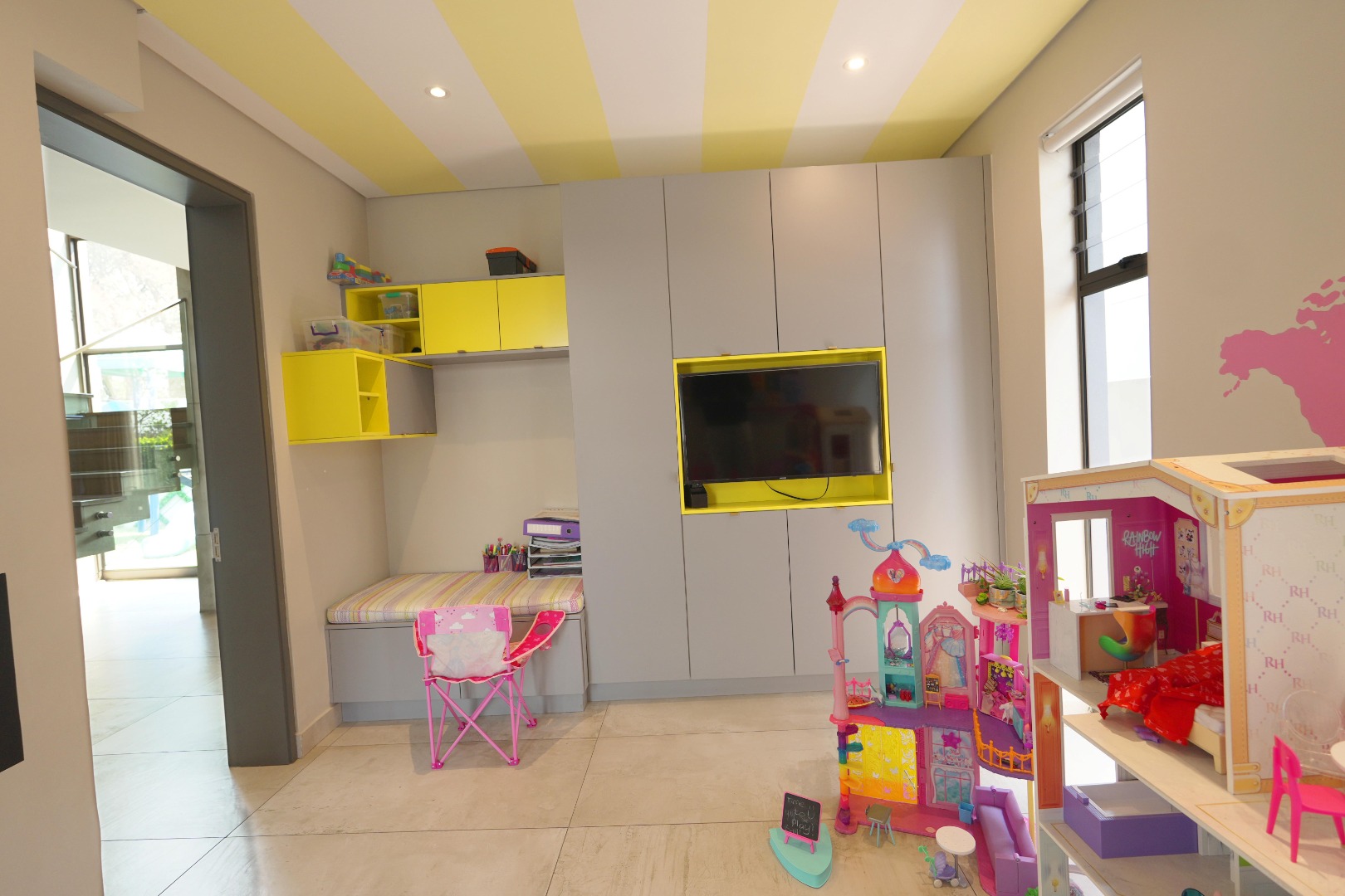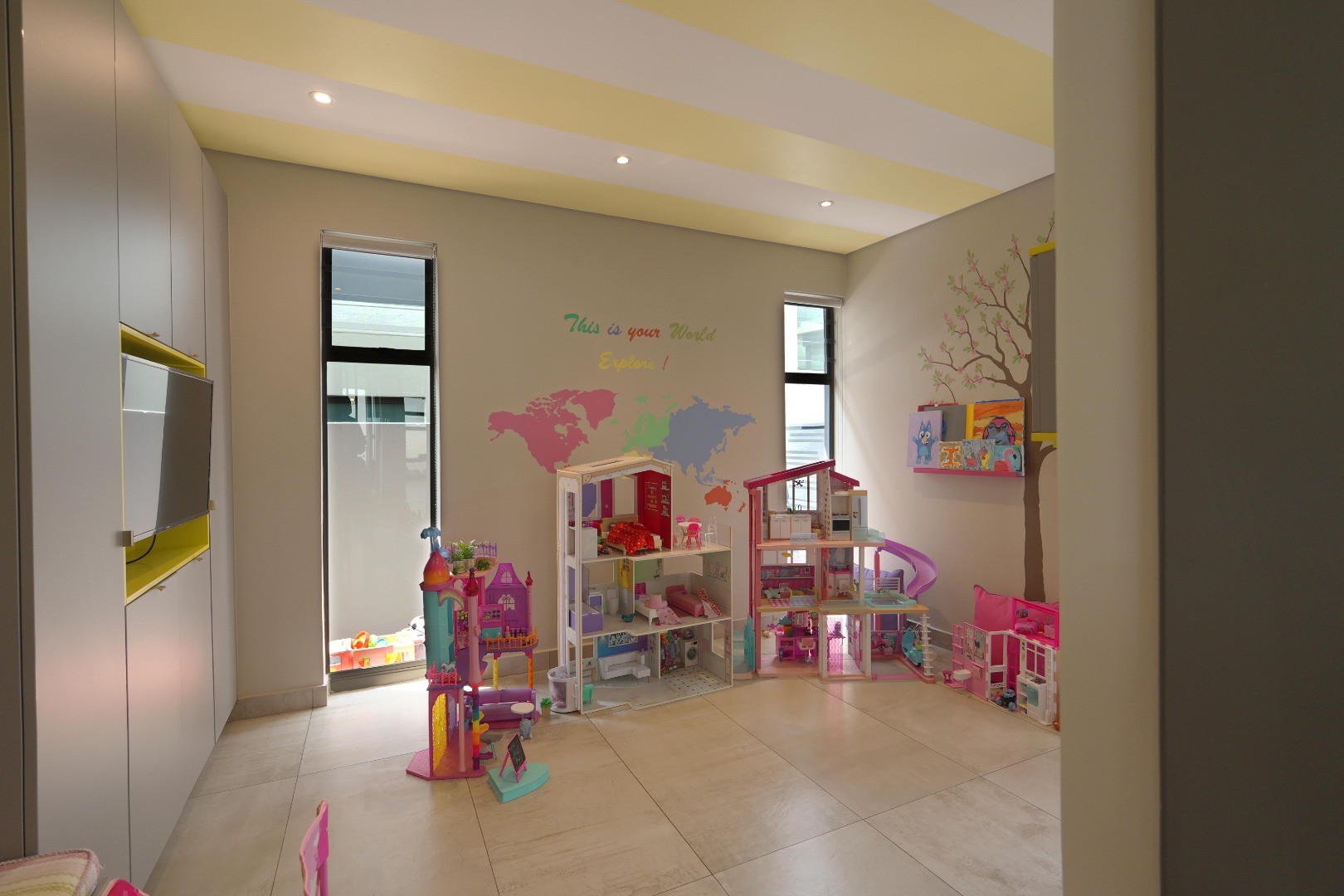 Just off the stairway to the upper level, you'll find a delightful playroom or study equipped with built-in cupboards. This versatile space can easily serve as a fifth bedroom or a guest suite, alongside a second open-plan lounge area.