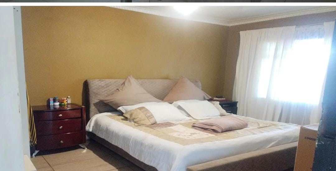 Located in the vibrant community of Eldorado Park, Soweto, this property offers a suburban lifestyle with convenient access to local amenities. The interior features two spacious lounges, providing ample room for relaxation and entertaining, complete with modern tiled flooring and contemporary ceiling designs. The heart of the home is a modern kitchen, equipped with sleek light cabinetry, dark countertops, and stainless steel appliances including a built-in oven, microwave, and stylish range hood. A functional kitchen island, some with an integrated breakfast bar, offers additional prep space. A fireplace adds a touch of warmth to the living environment. This home comprises three comfortable bedrooms, each offering natural light, tiled flooring, and decorative crown molding. The property includes one well-sized bathroom, catering to the household's needs. Externally, the property features a multi-bay garage structure, providing secure parking for two vehicles and additional storage. With a total of six parking bays, there is ample room for residents and guests. A garden and paving offer outdoor potential for landscaping and recreation. Security is enhanced with a solid perimeter wall, an access gate, and robust security gates within the living areas. While the exterior shows signs of wear, the brick construction and mature tree provide a foundation for improved kerb appeal with some maintenance. Key Features: * Three Bedrooms * One Bathroom * Two Lounges * Modern Kitchen with Stainless Steel Appliances * Multi-bay Garage (2 vehicles) * Six Parking Bays * Garden and Paving * Perimeter Wall and Access Gate * Fireplace