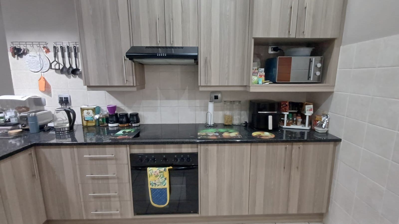 The heart of this home is its stylish kitchen, featuring light wood-grain cabinetry, dark countertops, and a practical tiled backsplash. It is well-equipped with a built-in oven, stovetop, range hood, and a dedicated microwave shelf, alongside a functional island with seating. The residence offers three comfortable bedrooms, including a main bedroom with an en-suite bathroom, providing privacy and convenience.