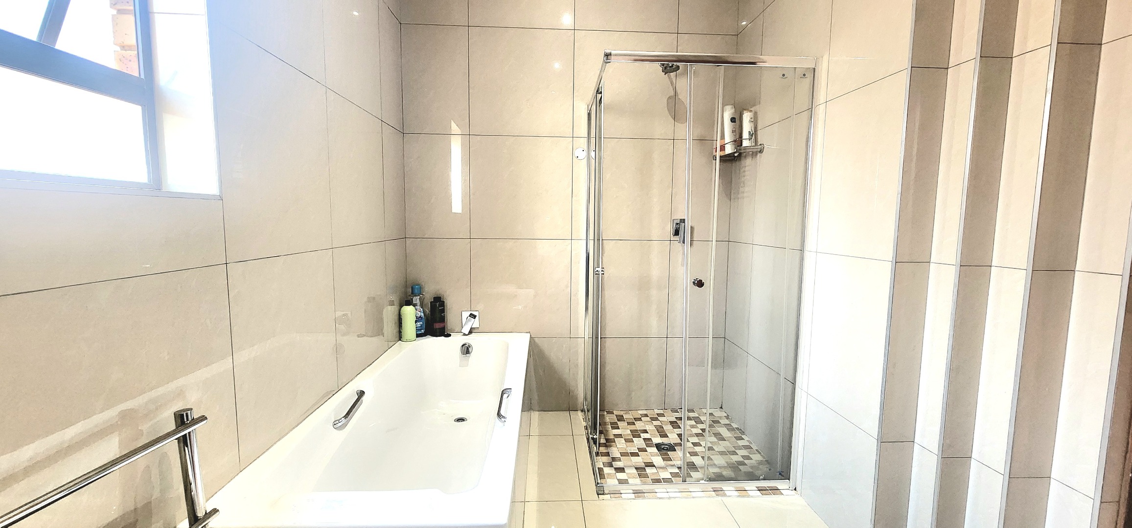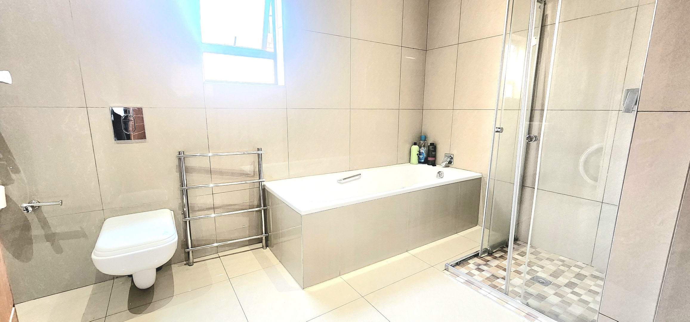 The well-appointed bedroom includes built-in mirrored wardrobes, offering ample storage and enhancing the sense of space. It benefits from tiled flooring and natural light, creating a serene personal retreat. The en-suite bathroom is a modern sanctuary, featuring neutral tiling, a separate bathtub, a walk-in shower with a glass enclosure, and a heated towel rail for added comfort.