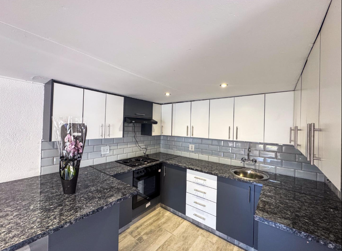 Discover an unparalleled lifestyle within this exquisite 3-bedroom, 1-bathroom residence, nestled in the esteemed Meyersdal suburb of Alberton. This unfurnished sanctuary boasts a meticulously designed open-plan living concept, where contemporary elegance meets functional sophistication. The gourmet kitchen features chic two-tone cabinetry, lustrous granite-look countertops, a stylish subway tile backsplash, and integrated cooking appliances. Pristine wood-look tile flooring and subtle recessed lighting complete this culinary haven.