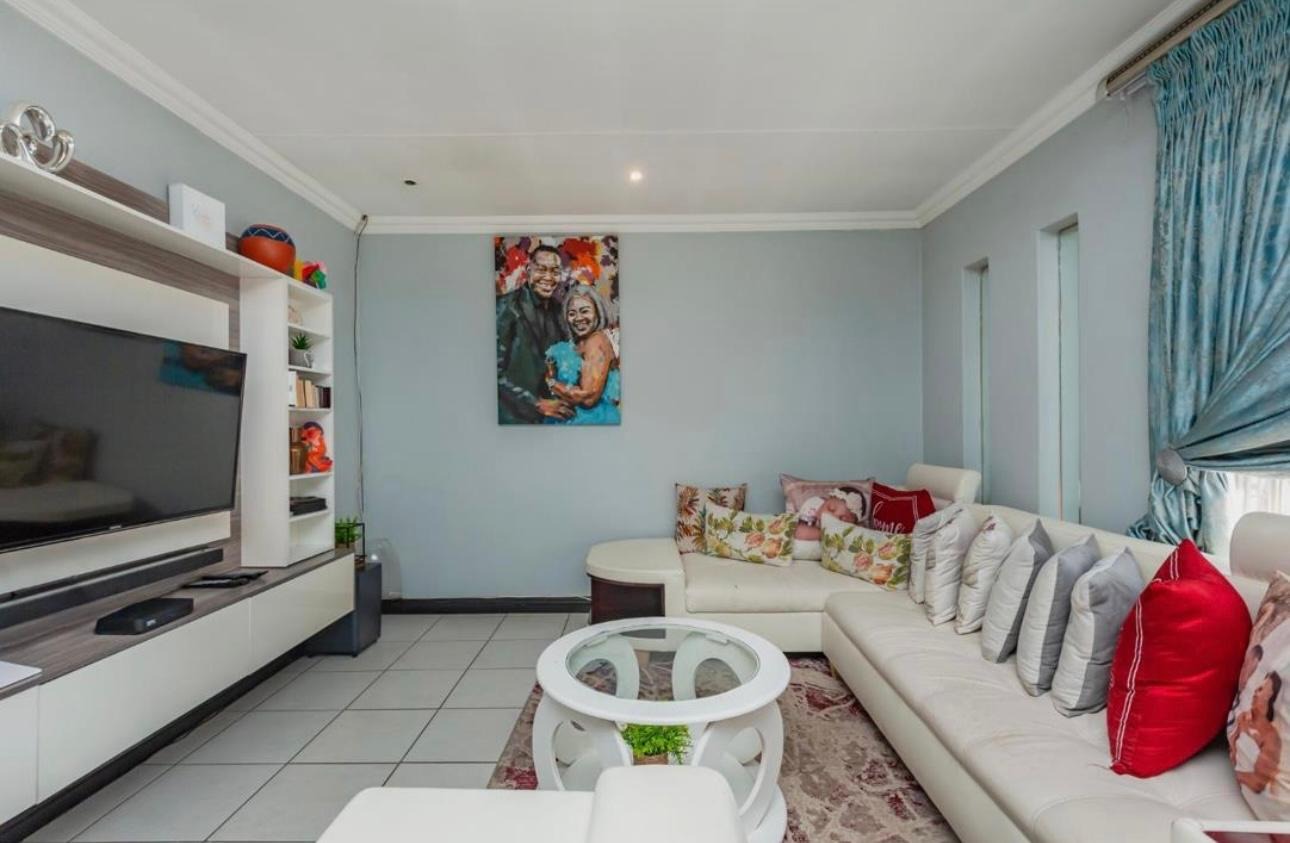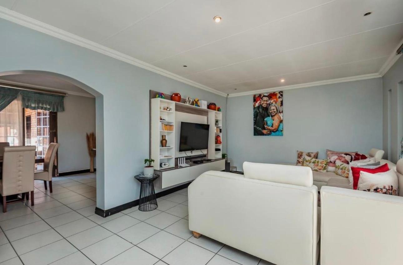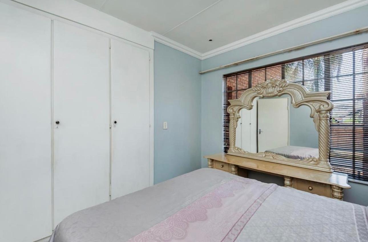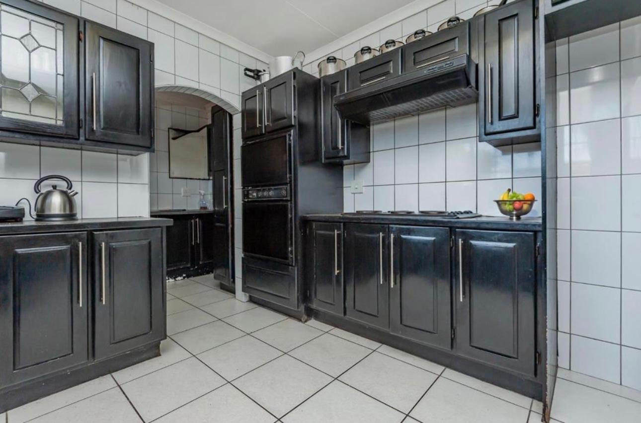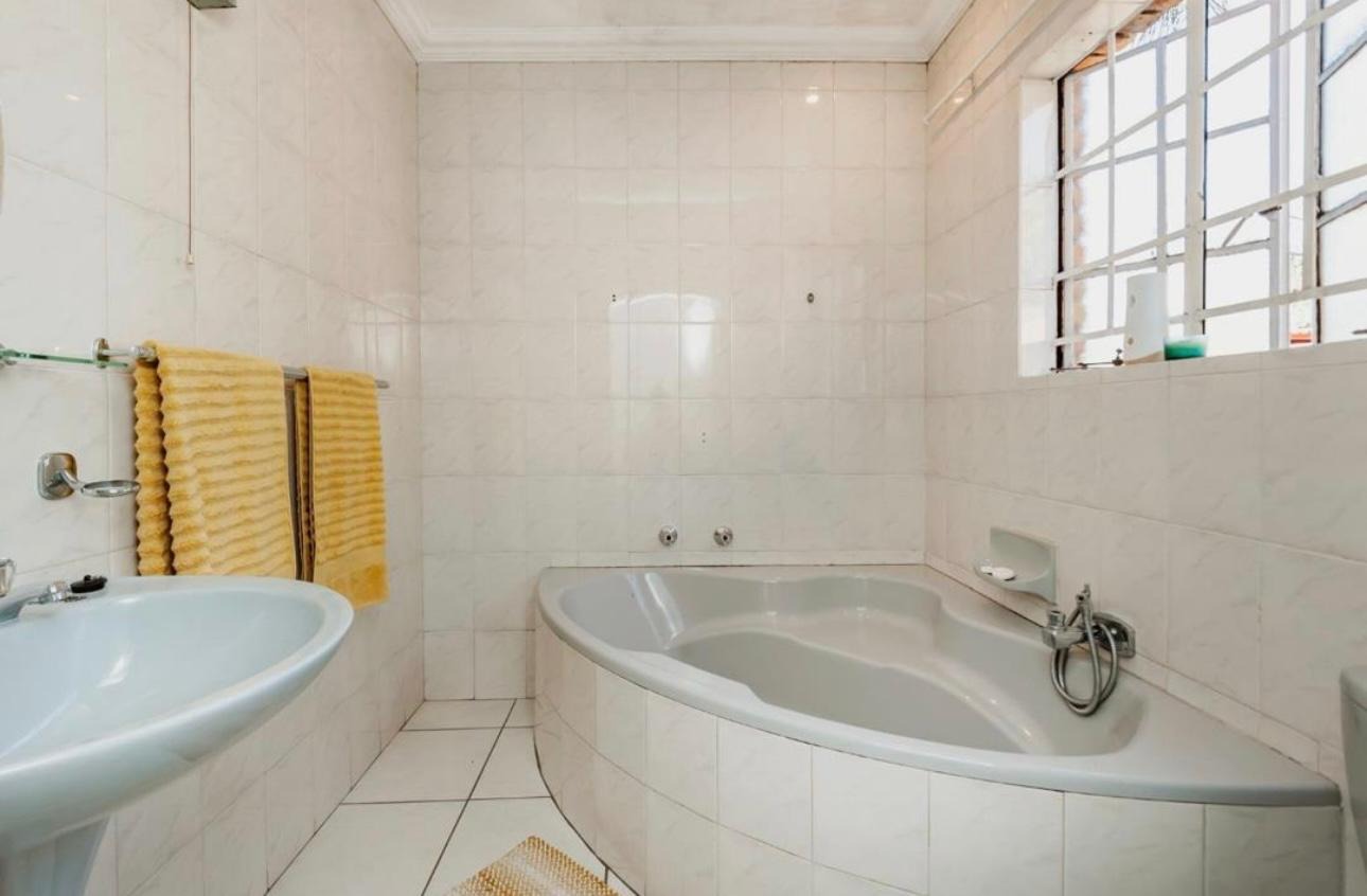 This distinguished four-bedroom residence, available for rent in the suburban enclave of Parkhill Gardens, Germiston, offers an exceptional living experience. The property features 2.5 well-appointed bathrooms, including a private en-suite, ensuring comfort and convenience for all occupants. The interior boasts a dedicated kitchen, a formal dining room, a spacious lounge, and an additional family/TV room, providing ample space for both relaxation and social gatherings. Modern amenities include tiled flooring throughout, recessed lighting, and a built-in entertainment unit, contributing to a sophisticated aesthetic. Practical considerations are met with two secure garages and five additional parking bays, complemented by extensive paving. Staff quarters are also provided, enhancing the property's functionality.