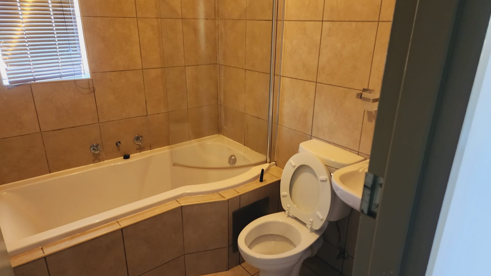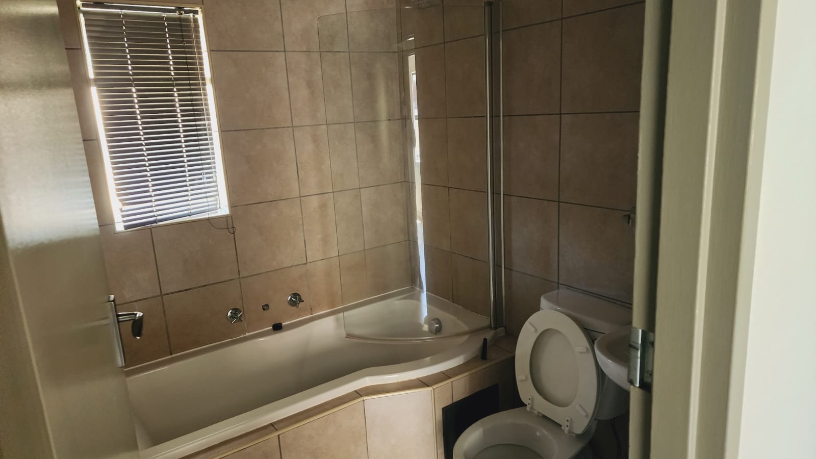 The bathroom is neatly tiled and fitted with a bathtub, basin, and toilet, with a built-in shower, offering both comfort and functionality. (Private Property)
