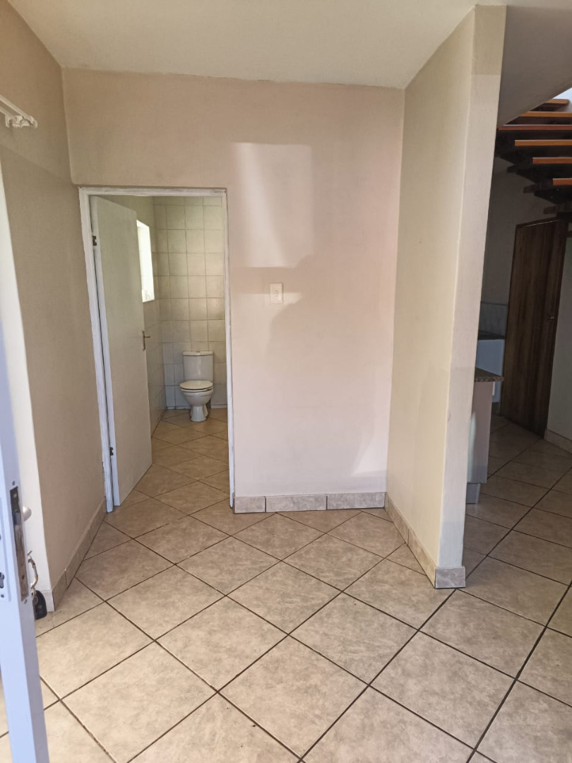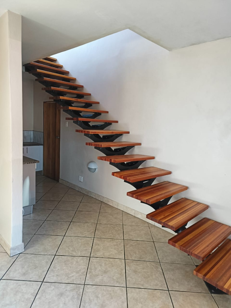 Perfect for a young professional,a couple or single person is this single bedroom up for rental in the popular suburb of Linmeyer. Inside, the property presents a well-designed layout including one bedroom, one bathroom, a dedicated lounge area, and a functional kitchen.A striking open-tread wooden staircase with black metal supports serves as a modern focal point, connecting the levels and enhancing the interior aesthetic.