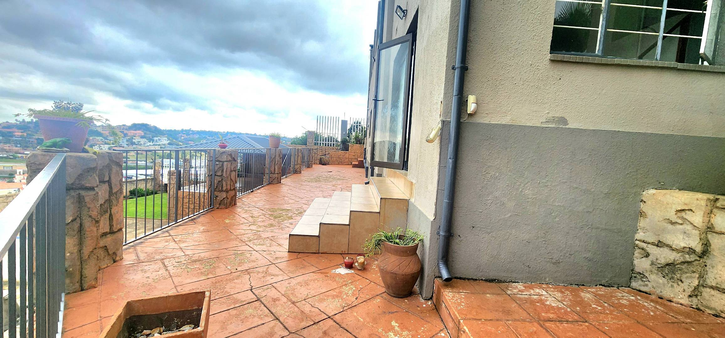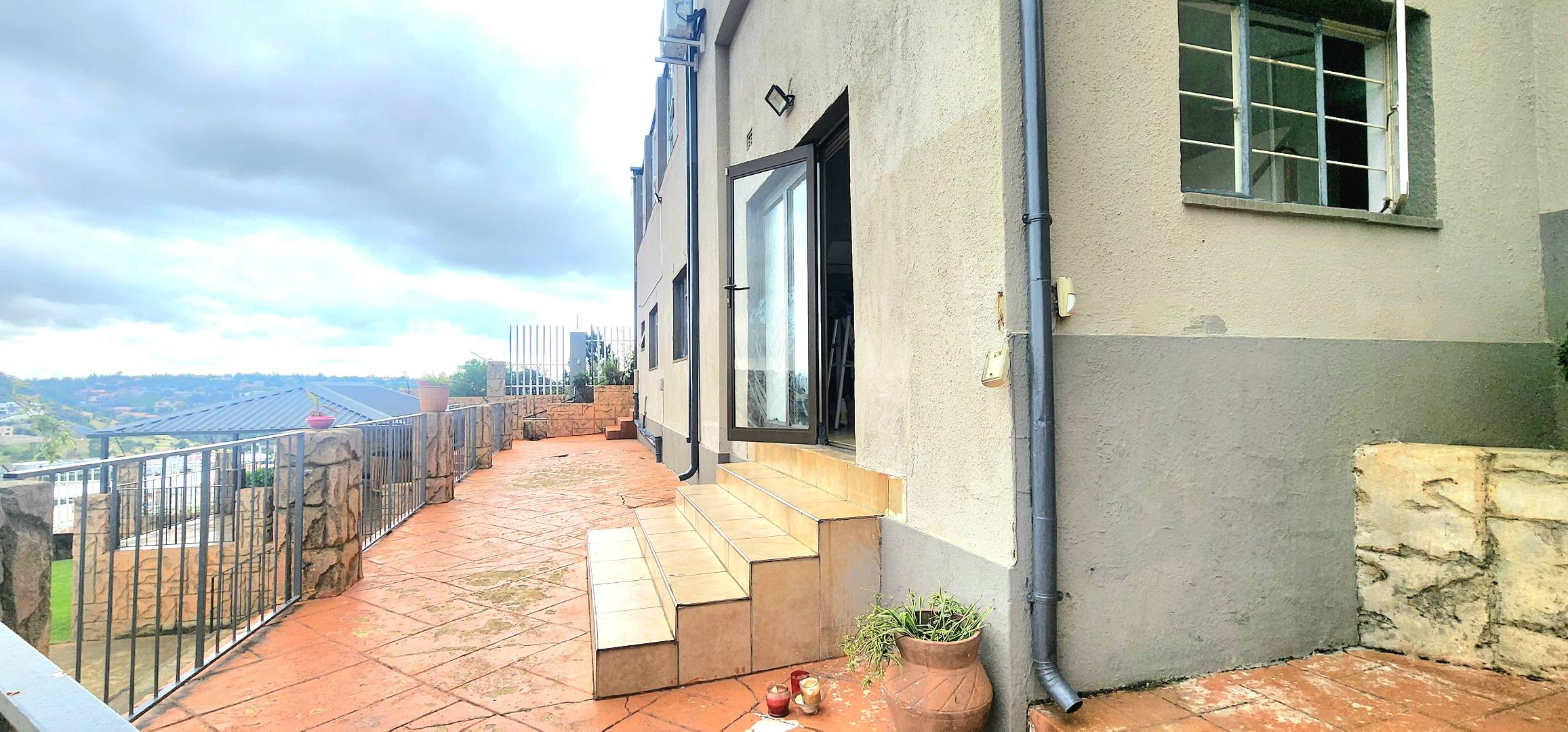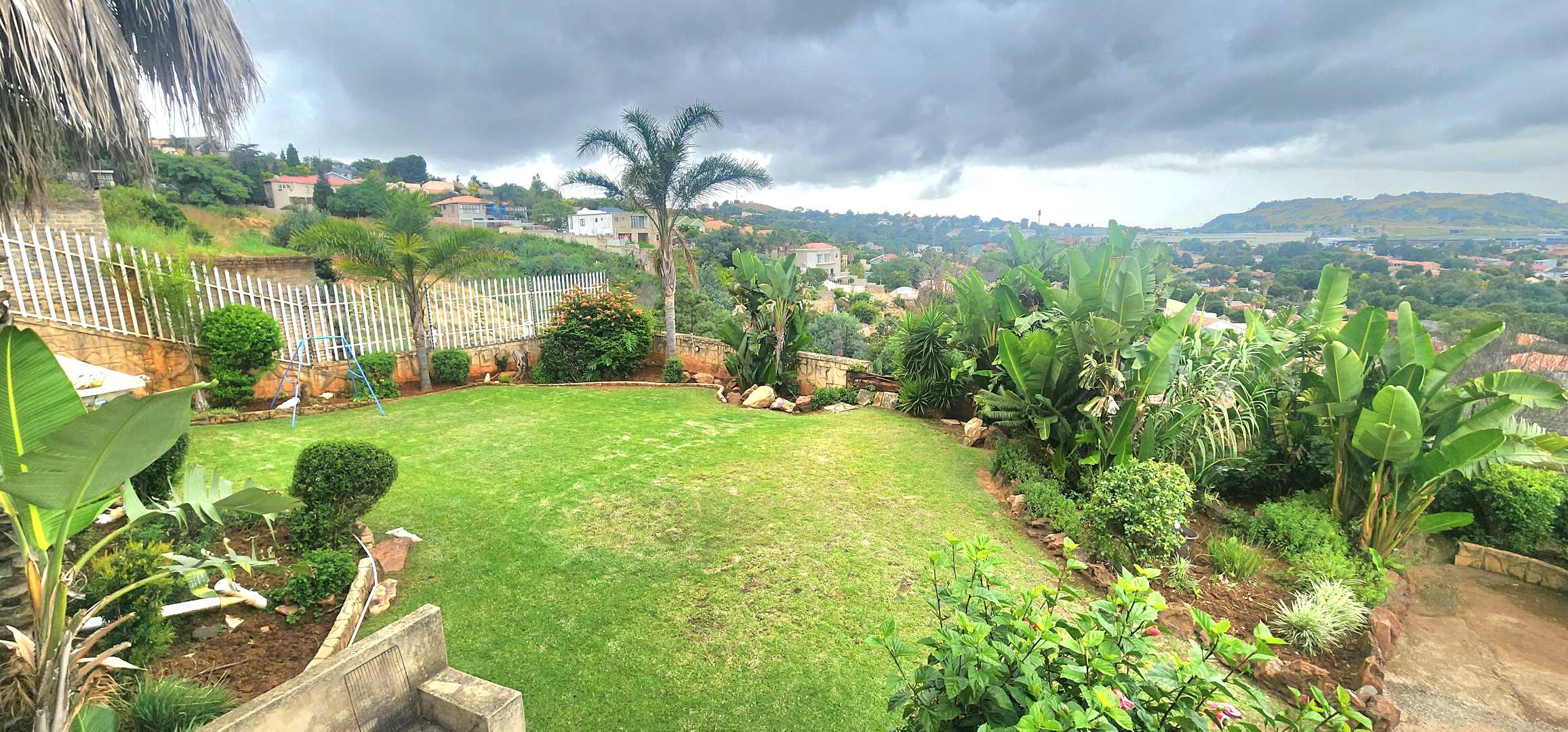 Step outside to embrace the property's multi-level terraced layout, adorned with tasteful stone accents. Expansive sliding doors lead to a generous patio and balcony, presenting breathtaking panoramic views of the vibrant Johannesburg cityscape and distant hills. The meticulously maintained garden, featuring a lush lawn and tropical landscaping, provides a serene outdoor sanctuary. A covered entertainment area offers an ideal setting for al fresco gatherings, complementing the property's inviting exterior.
