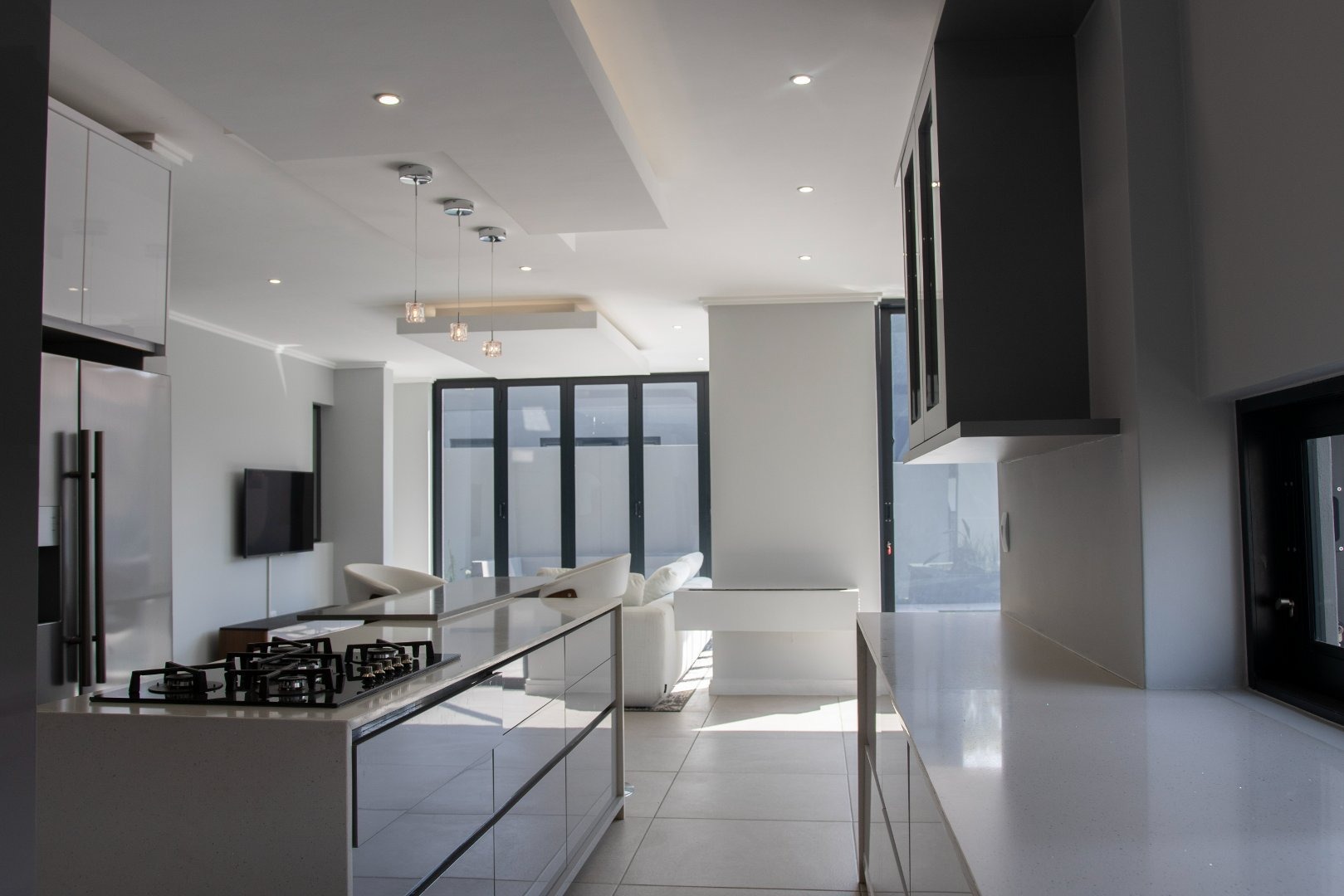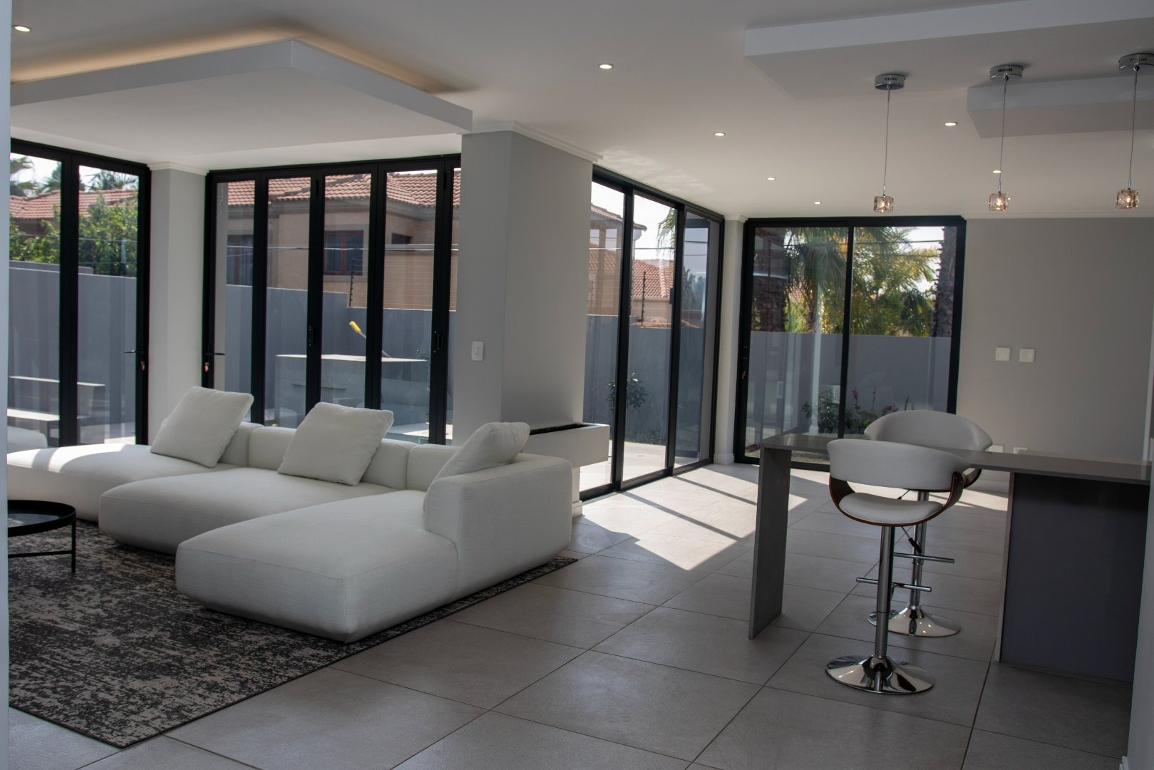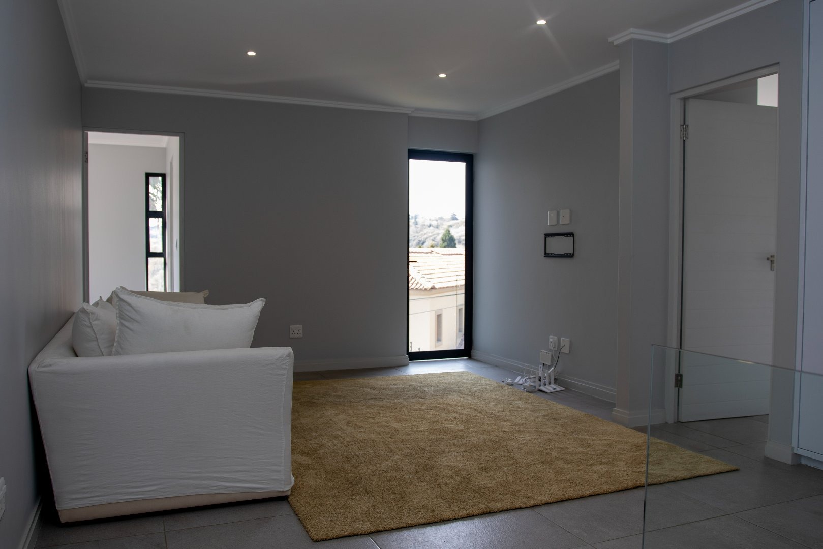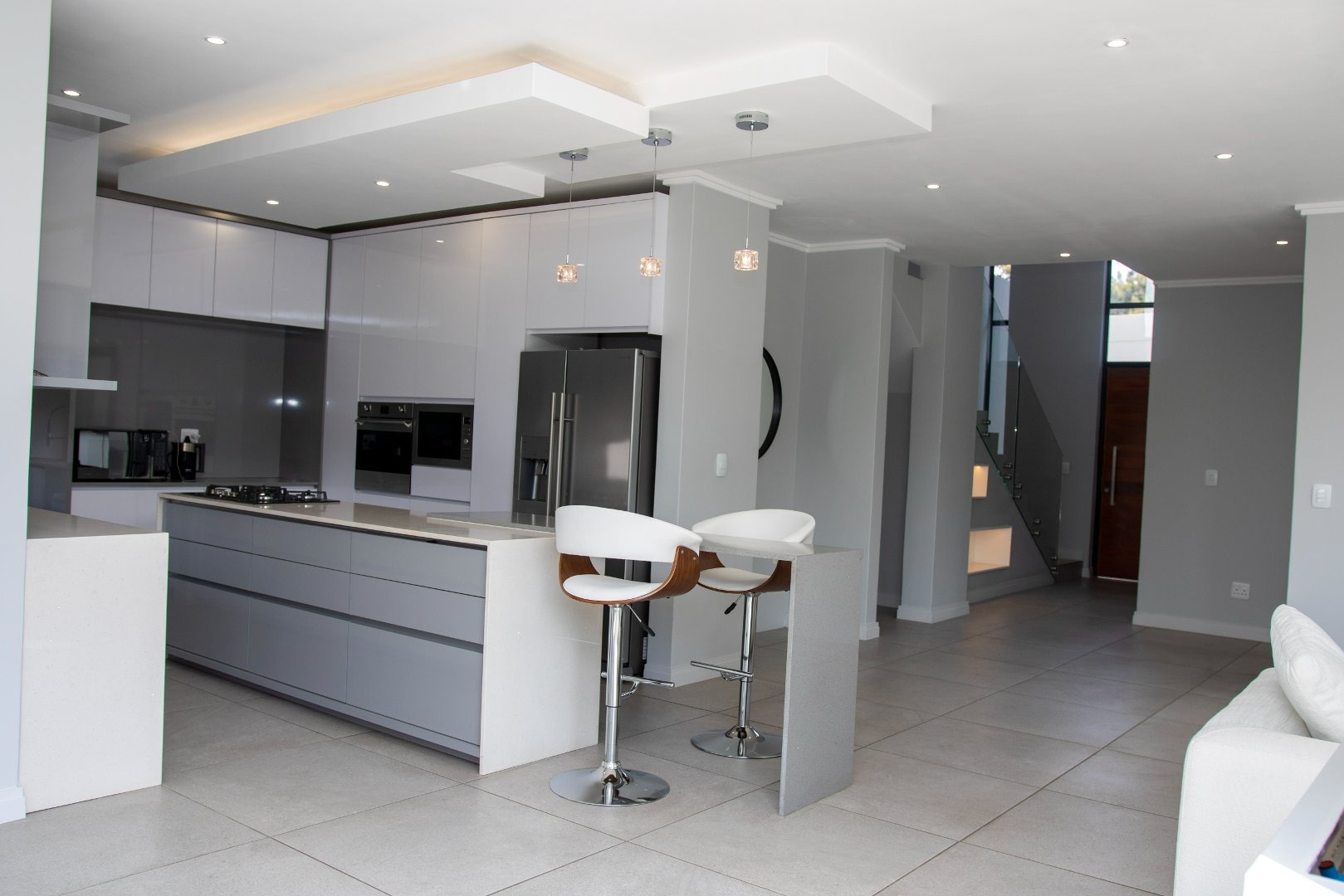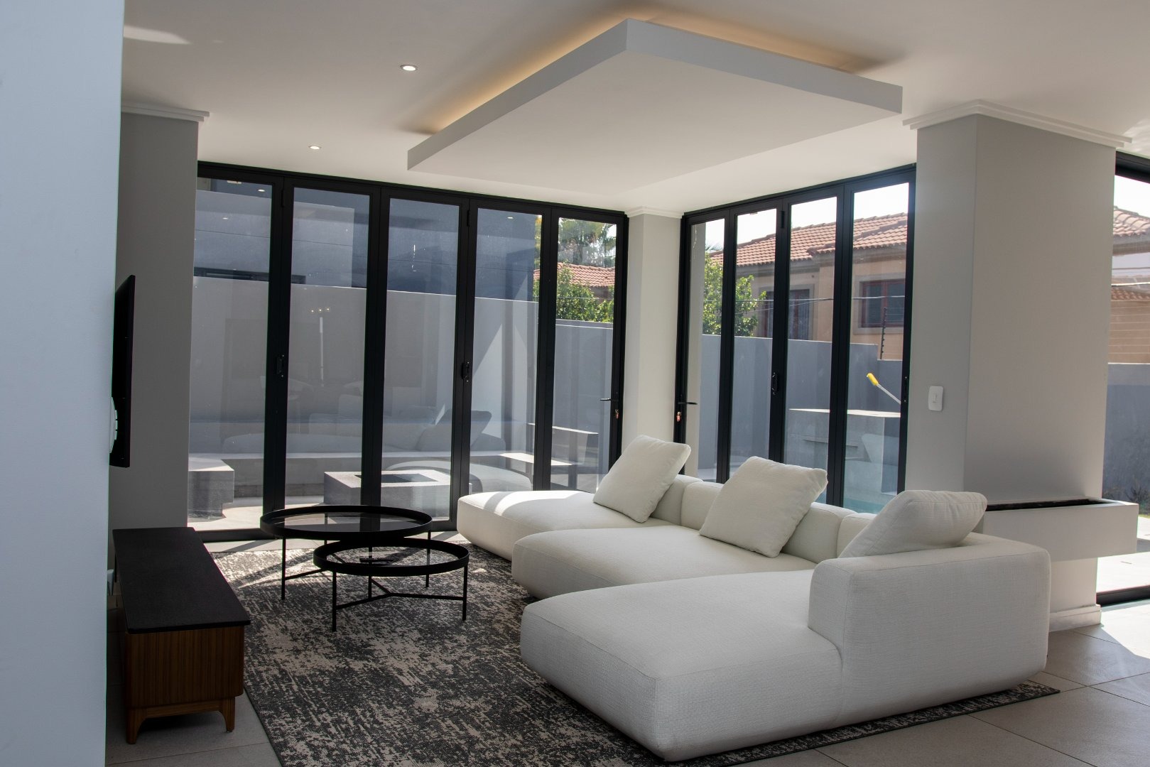 Open-plan reception areas: 2 formal lounges, dining, family room, kitchen with separate scullery. Modern designer kitchen, an island, loads of cupboards space in a white high-gloss finish with quarts tops and guest toilet. A rooftop garden and entertainment area. The living area leads out onto an expansive undercover patio with a built-in gas braai and a spectacular swimming pool set in a private garden. The ground floor comprises of a double-volume grand entrance with a floating glass staircase. Stacking doors lead onto a garden /pool area. The double automated garage allows direct access to the house.