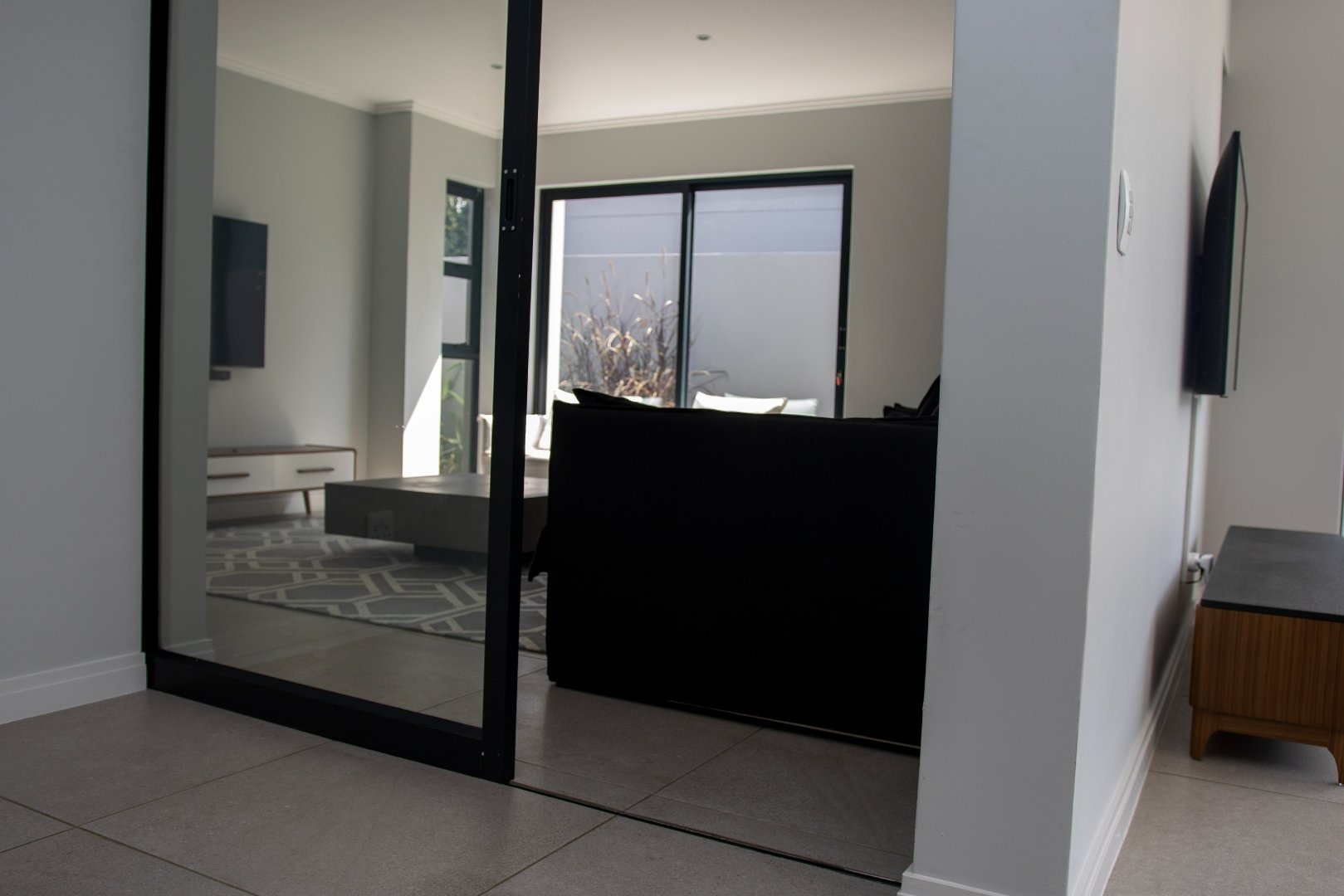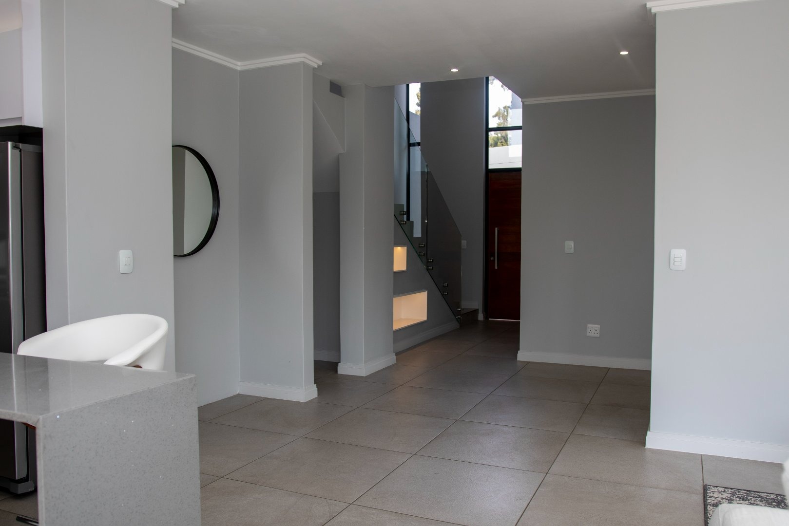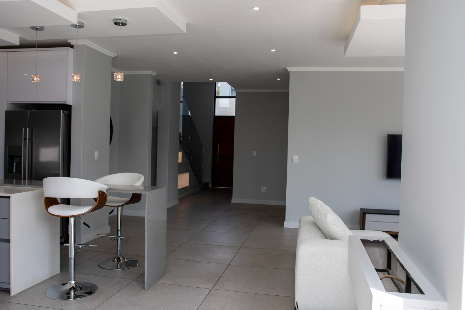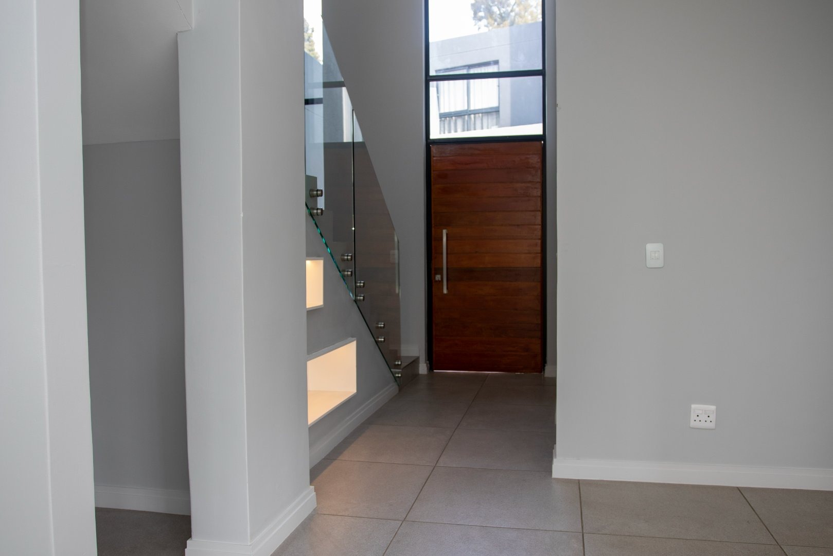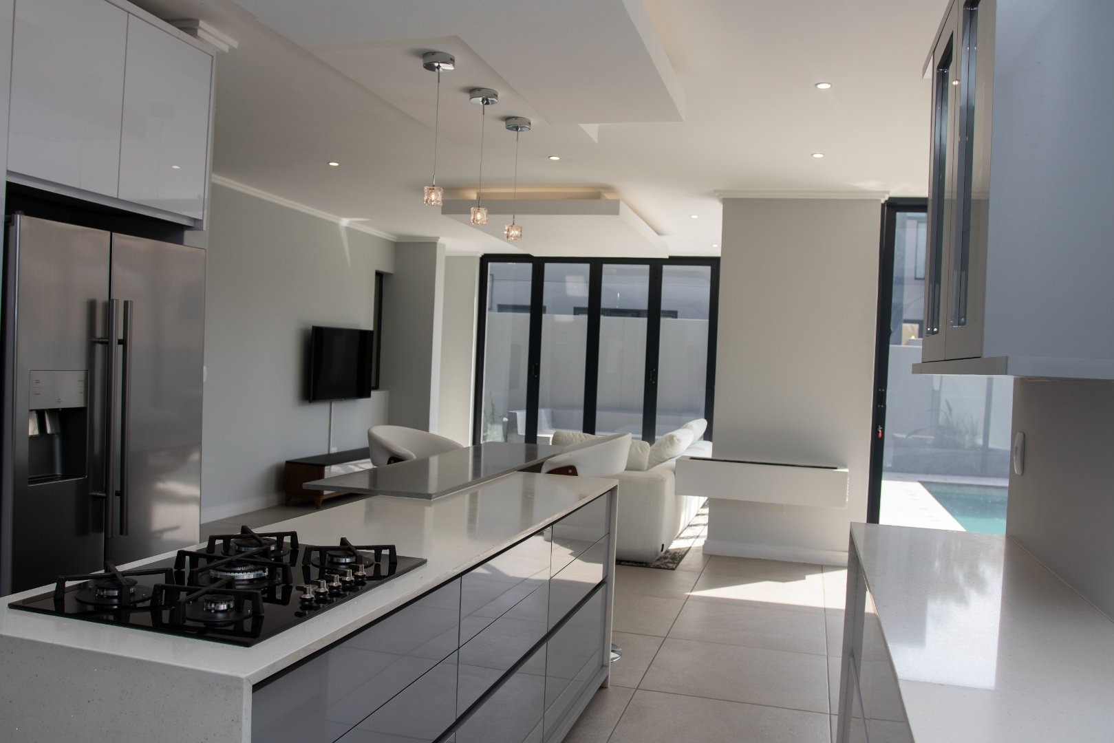 Open-plan reception areas: 2 formal lounges, dining, family room, kitchen with separate scullery. Modern designer kitchen, an island, loads of cupboards space in a white high-gloss finish with quarts tops and guest toilet. A rooftop garden and entertainment area. The living area leads out onto an expansive undercover patio with a built-in gas braai and a spectacular swimming pool set in a private garden. The ground floor comprises of a double-volume grand entrance with a floating glass staircase. Stacking doors lead onto a garden /pool area. The double automated garage allows direct access to the house.