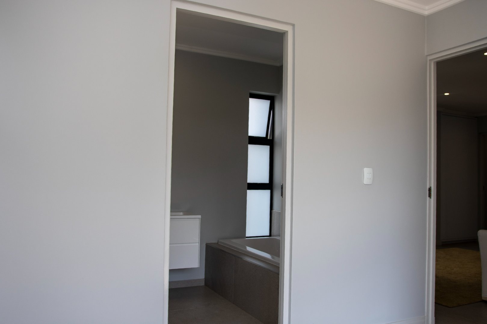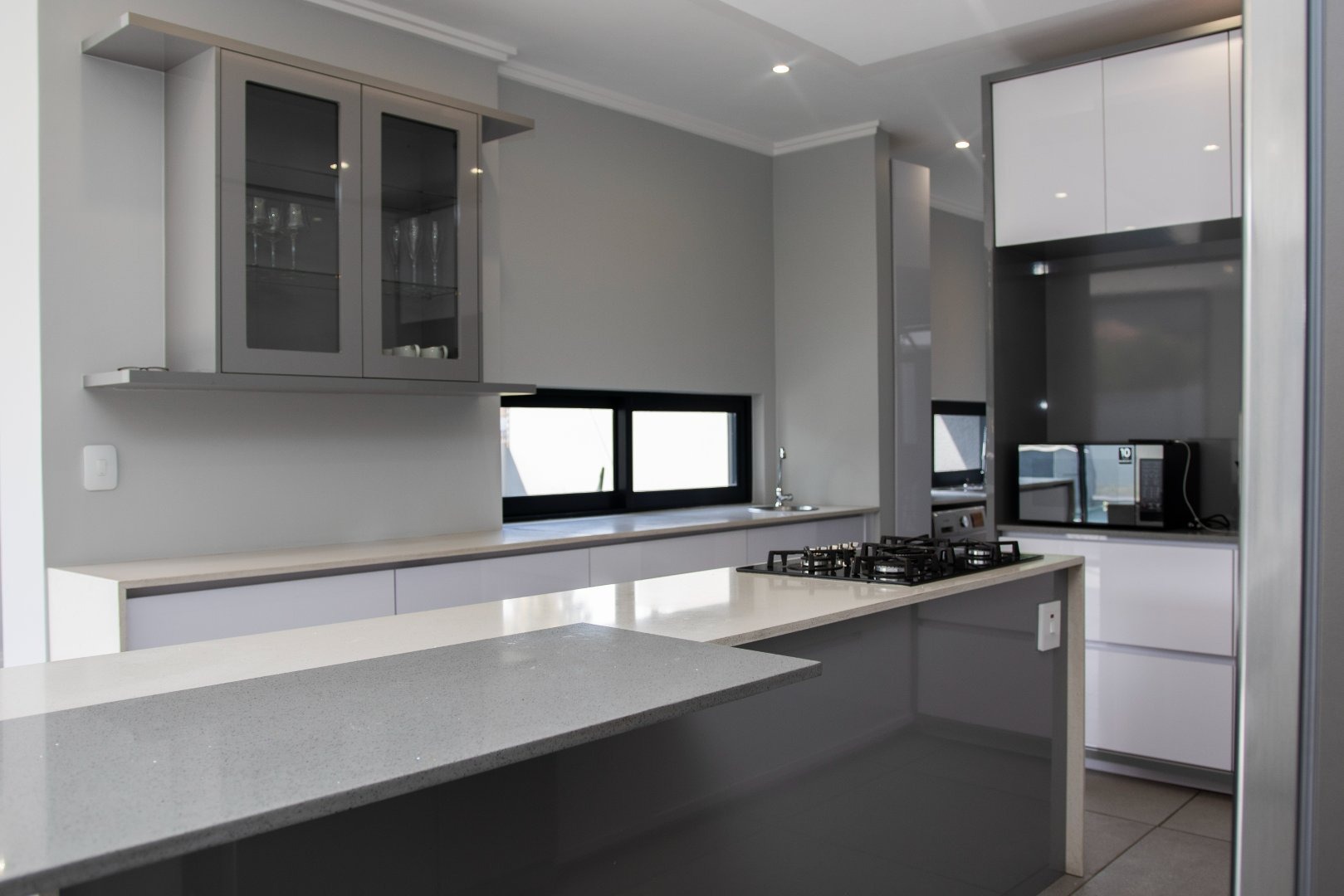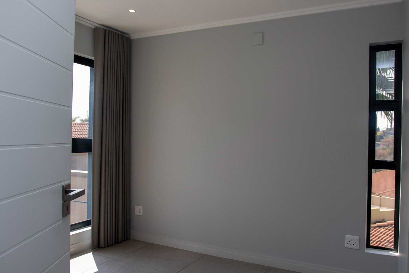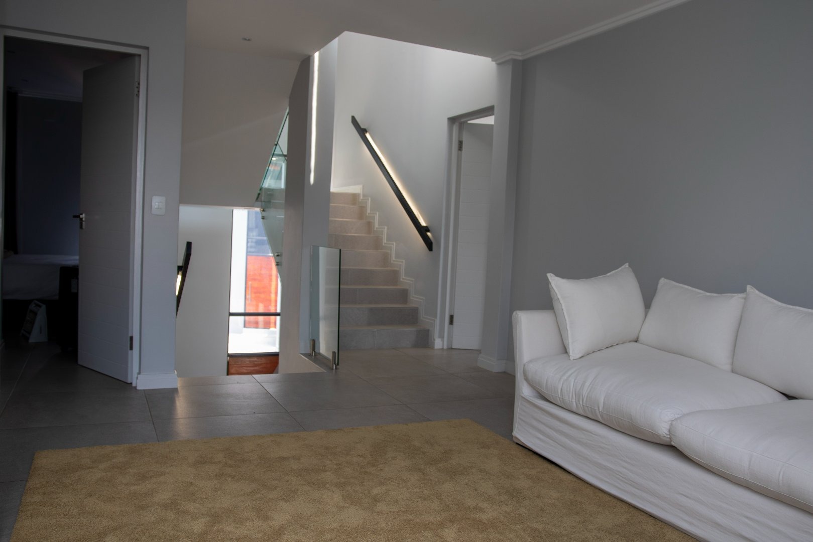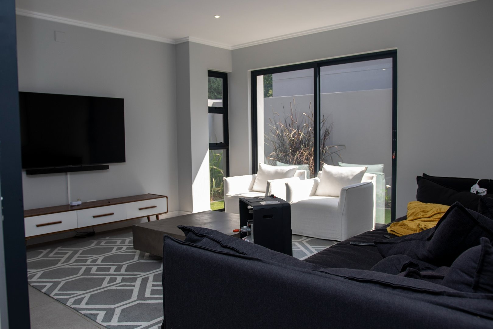 Open-plan reception areas: 2 formal lounges, dining, family room, kitchen with separate scullery. Modern designer kitchen, an island, loads of cupboards space in a white high-gloss finish with quarts tops and guest toilet. A rooftop garden and entertainment area. The living area leads out onto an expansive undercover patio with a built-in gas braai and a spectacular swimming pool set in a private garden. The ground floor comprises of a double-volume grand entrance with a floating glass staircase. Stacking doors lead onto a garden /pool area. The double automated garage allows direct access to the house.