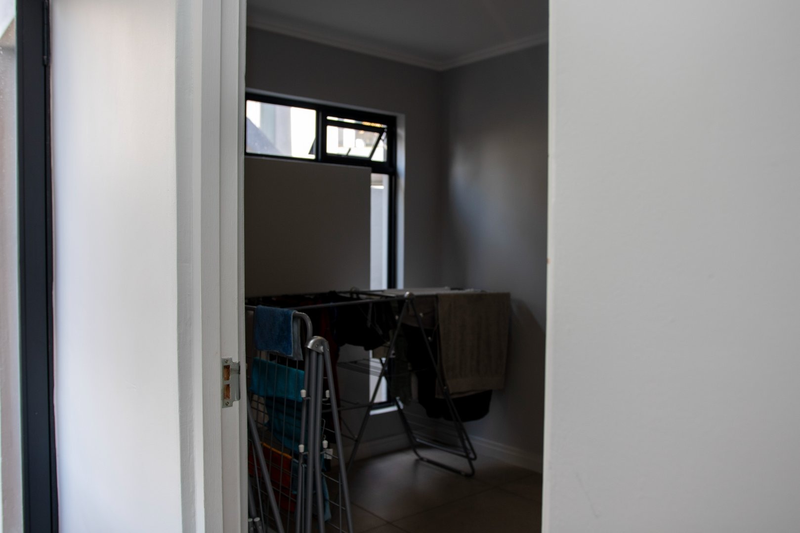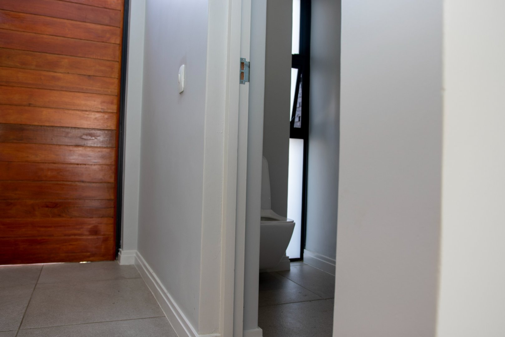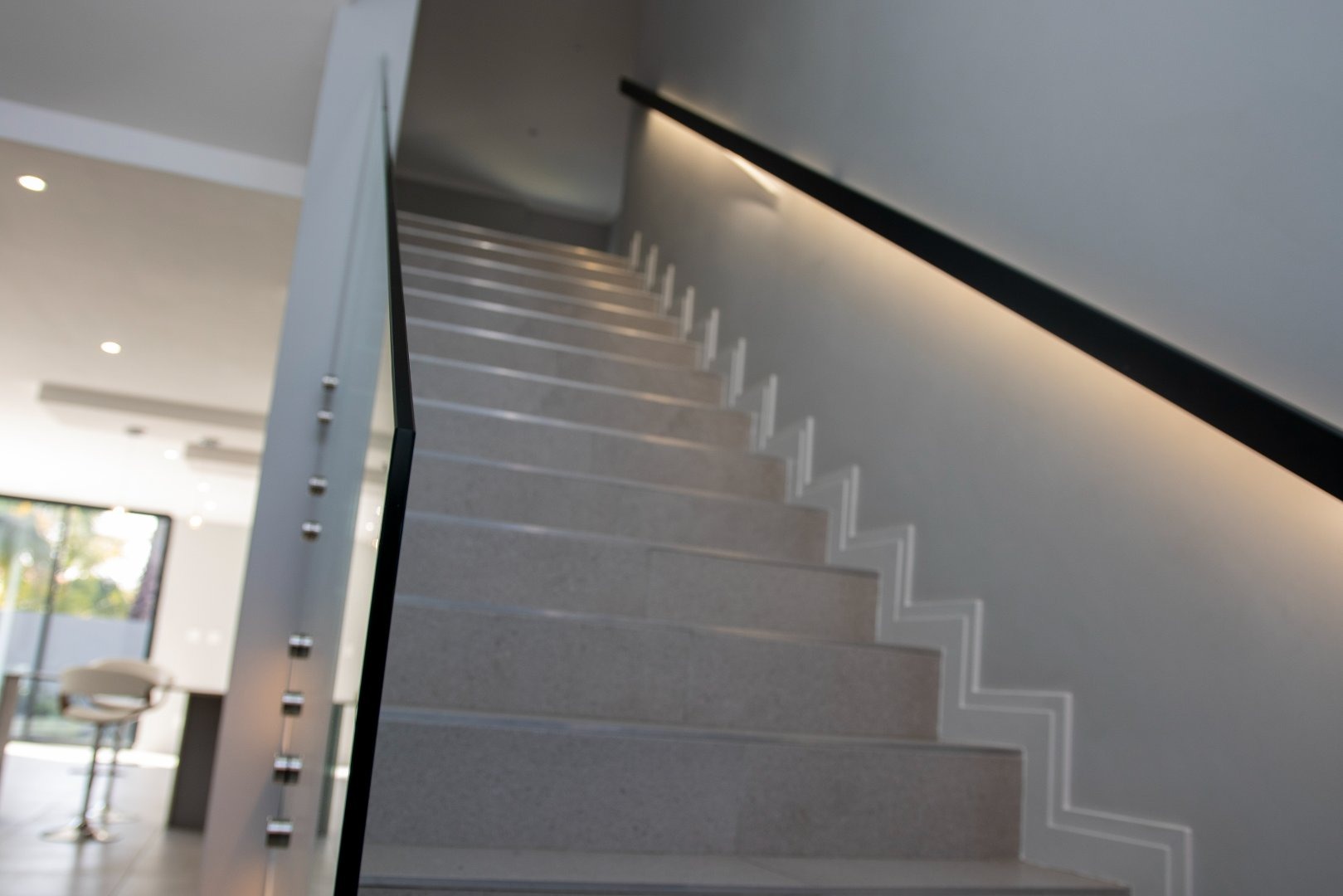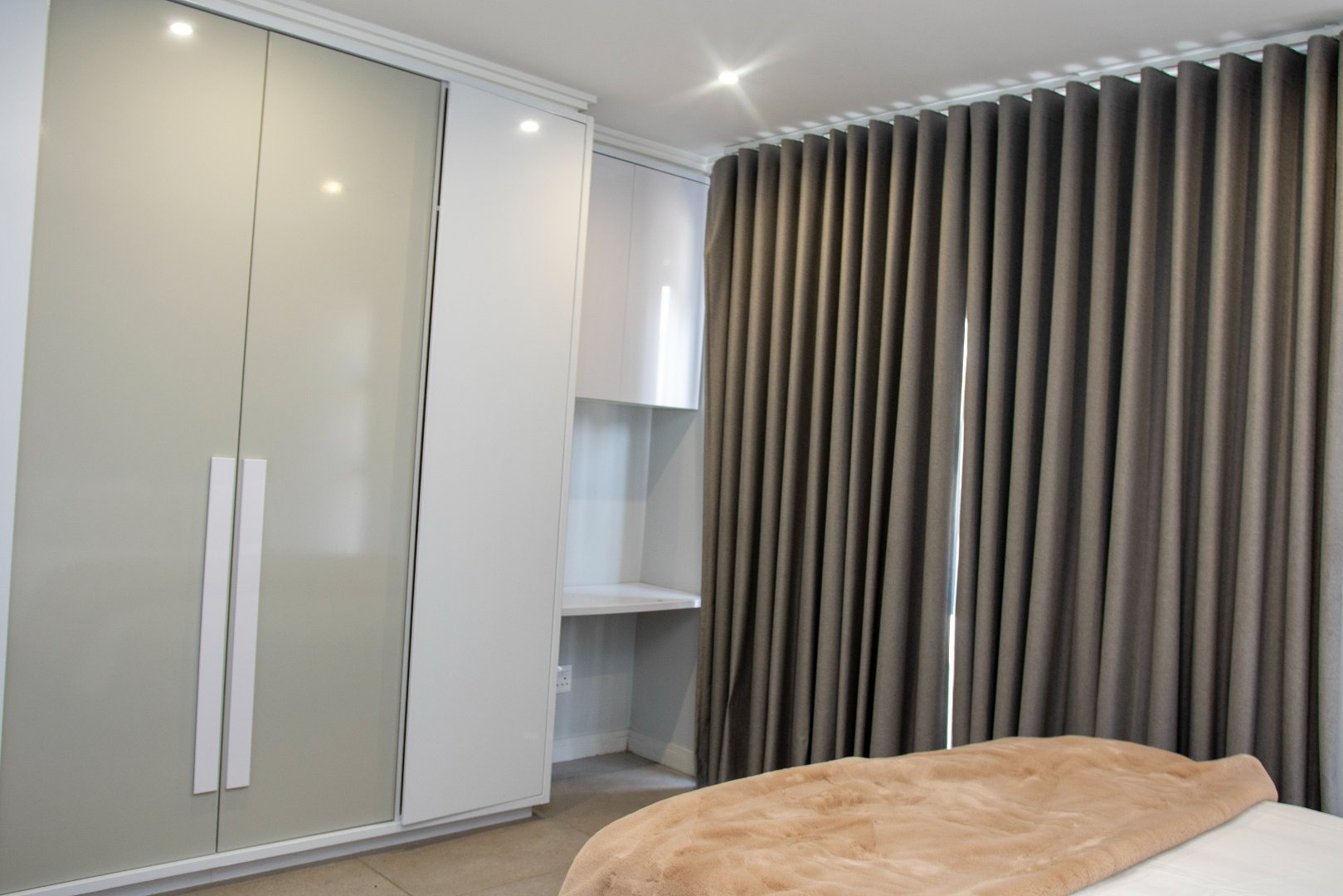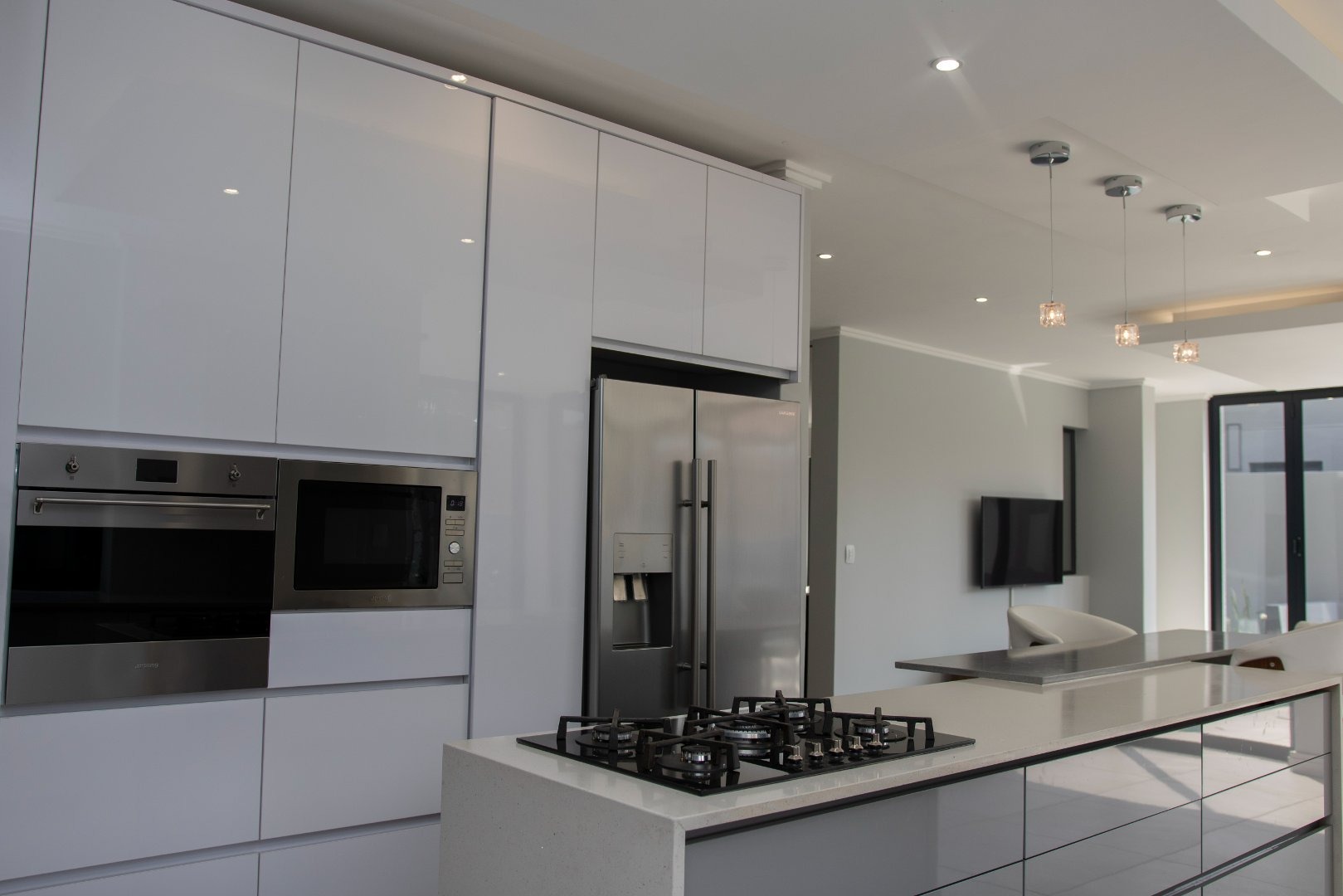 Open-plan reception areas: 2 formal lounges, dining, family room, kitchen with separate scullery. Modern designer kitchen, an island, loads of cupboards space in a white high-gloss finish with quarts tops and guest toilet. A rooftop garden and entertainment area. The living area leads out onto an expansive undercover patio with a built-in gas braai and a spectacular swimming pool set in a private garden. The ground floor comprises of a double-volume grand entrance with a floating glass staircase. Stacking doors lead onto a garden /pool area. The double automated garage allows direct access to the house.