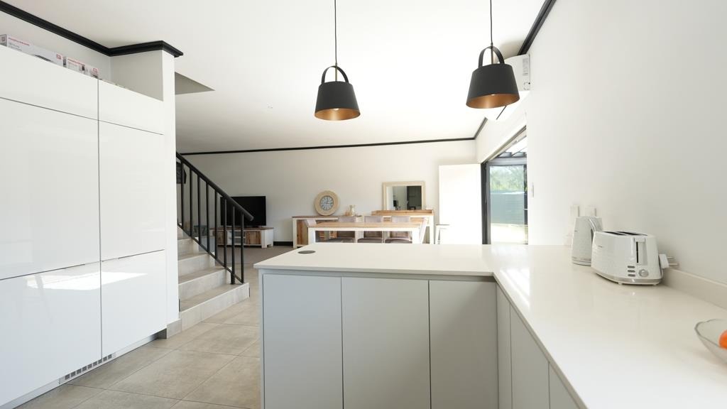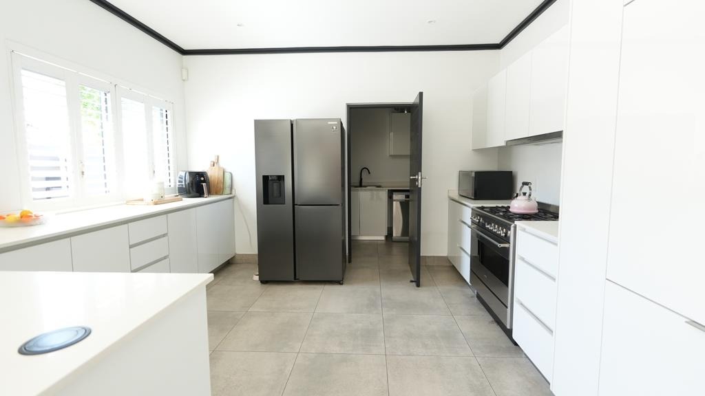 The sleek kitchen offers the ideal blend of style and functionality, featuring white granite countertops, high-gloss cabinetry, and a charming breakfast nook for casual dining. A separate scullery provides additional convenience, with space for three under-counter appliances.
