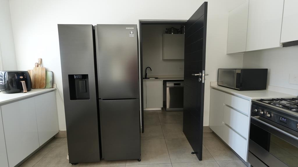 The sleek kitchen offers the ideal blend of style and functionality, featuring white granite countertops, high-gloss cabinetry, and a charming breakfast nook for casual dining. A separate scullery provides additional convenience, with space for three under-counter appliances.