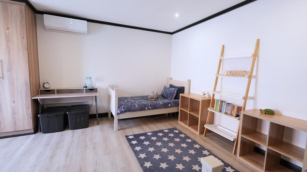 Upstairs, a cozy pajama lounge leads to three beautifully designed en-suite bedrooms. Each bedroom includes built-in cupboards, air conditioning, and modern bathrooms fitted with elegant, contemporary showers.
