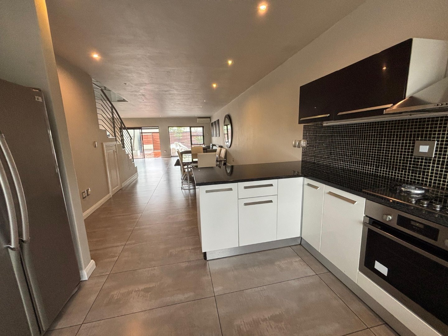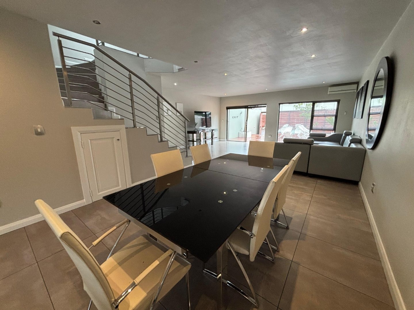 Open-Plan Living: A spacious kitchen, dining, and lounge area with an air conditioner, providing a perfect space for family and friends to gather.