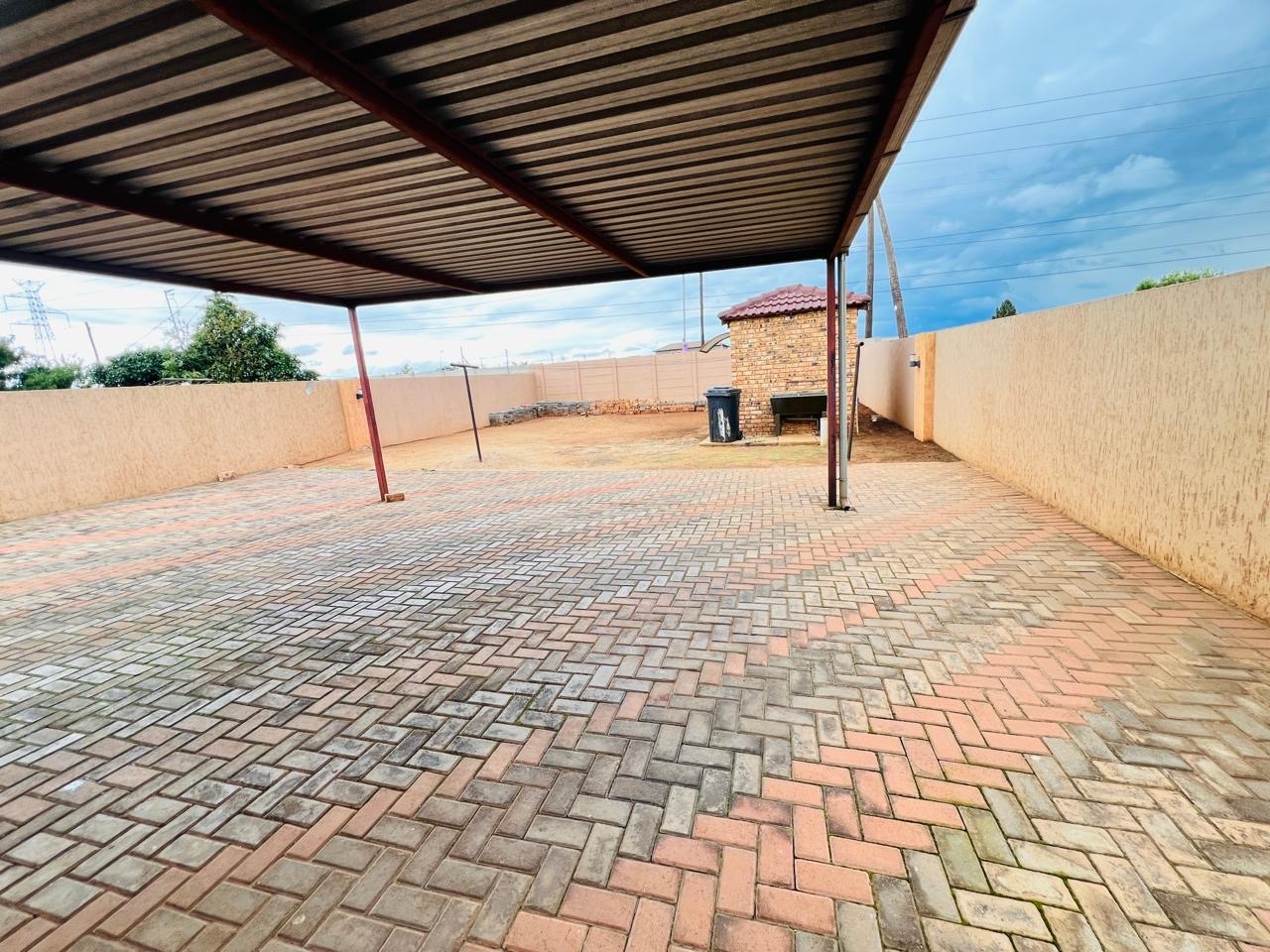Designed for practical living, this property is ideal for families or individuals seeking a low-maintenance lifestyle. The exterior boasts a neat brick finish and a tiled roof, presenting a well-maintained appearance. Enjoy the expansive paved driveway, offering ample parking space, and a covered carport area that doubles as a versatile outdoor entertainment zone. This space includes a built-in braai, perfect for social gatherings and outdoor cooking. A small, manicured lawn adds a touch of green without demanding extensive upkeep.