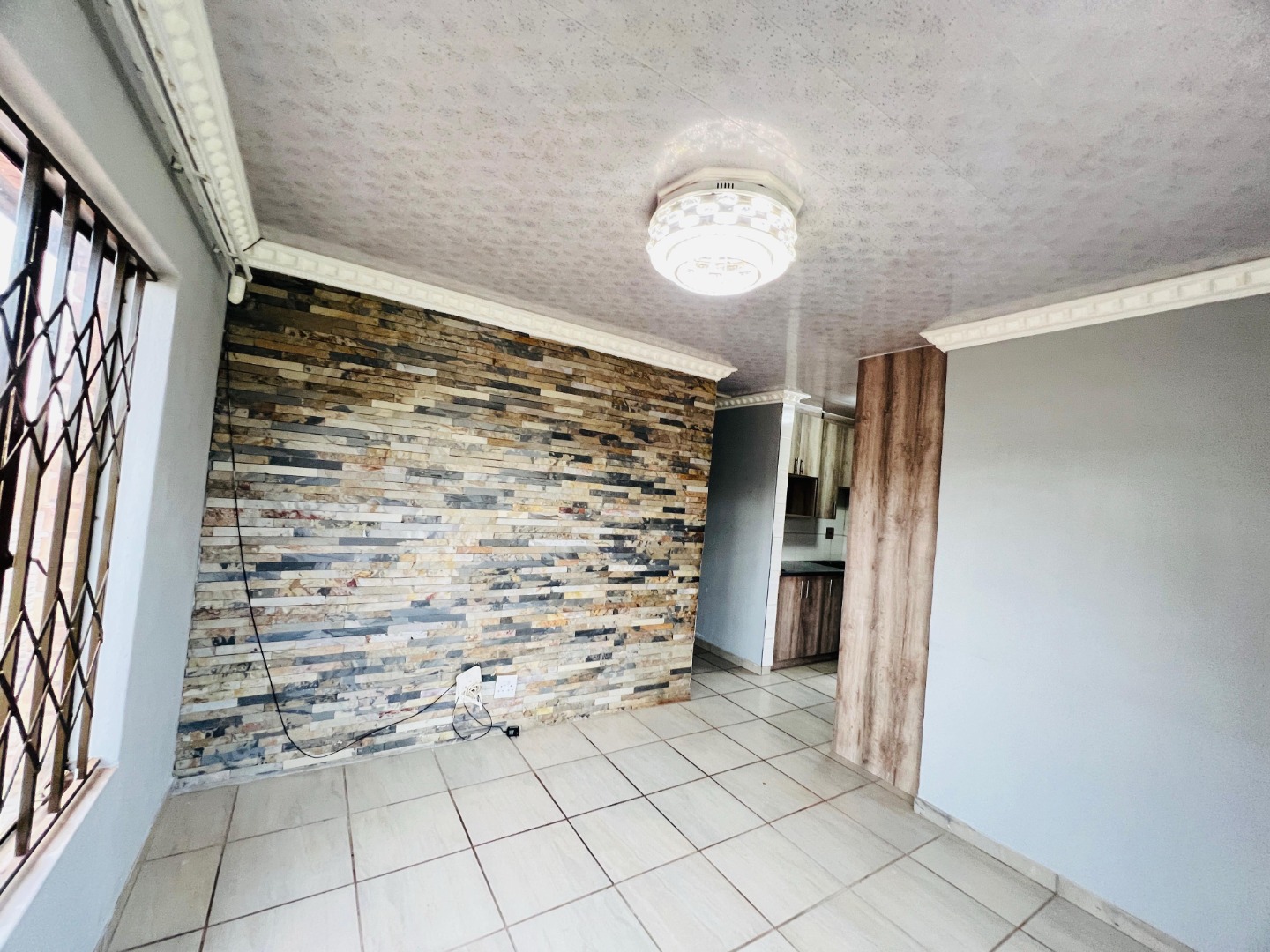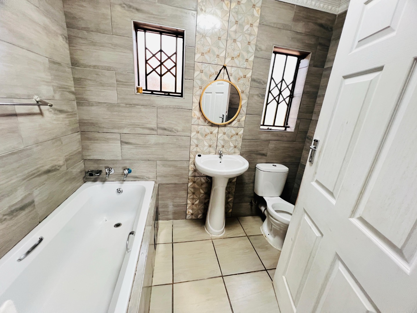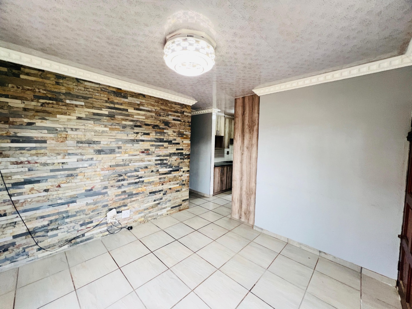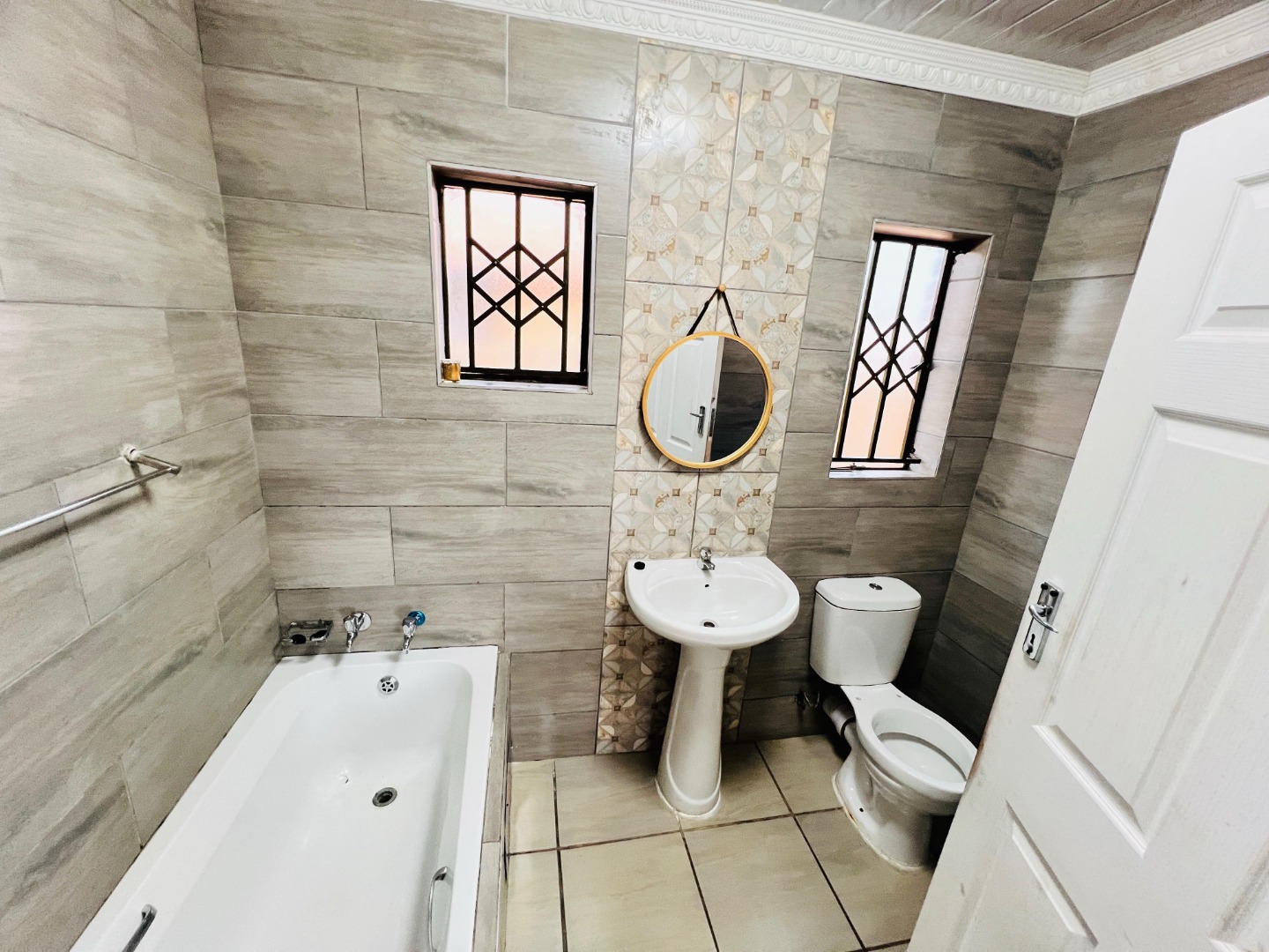 This inviting 3-bedroom, 1-bathroom rental home in Protea Glen ext 27, Soweto, offers a comfortable and secure living environment. The interior features durable tiled flooring throughout, ensuring easy maintenance. One room boasts a stylish stacked stone accent wall, adding a modern touch. The functional bathroom is fully tiled with a bathtub, pedestal sink, and toilet, providing a clean and contemporary space. A well-appointed kitchen completes the interior layout, ready for your culinary needs.