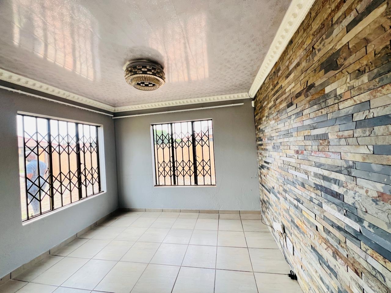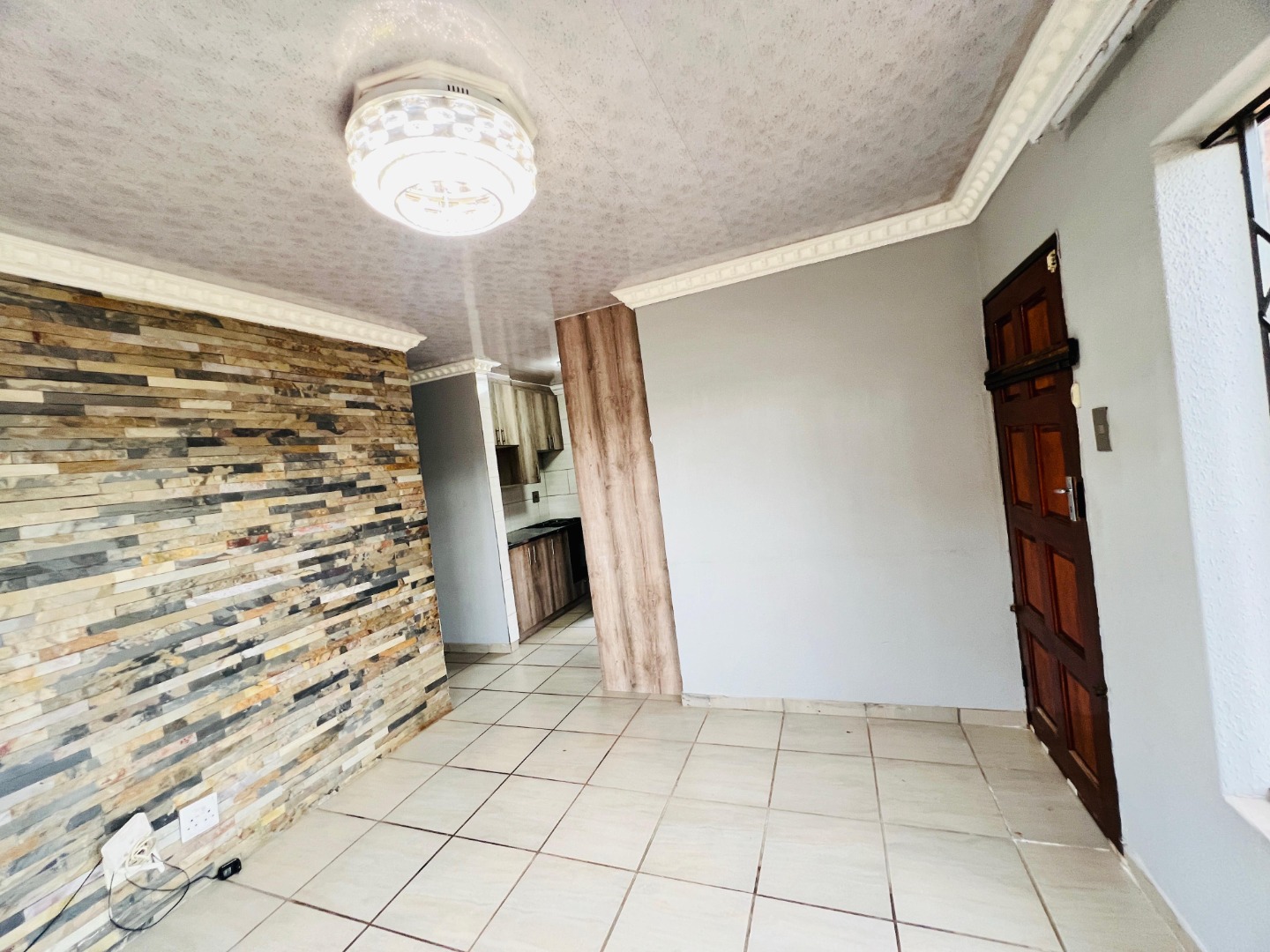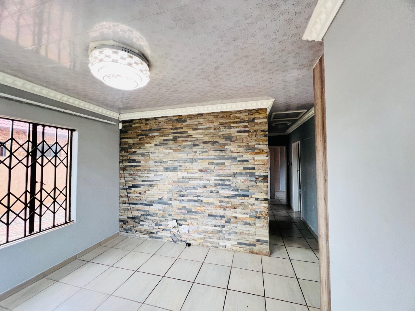 This inviting 3-bedroom, 1-bathroom rental home in Protea Glen ext 27, Soweto, offers a comfortable and secure living environment. The interior features durable tiled flooring throughout, ensuring easy maintenance. One room boasts a stylish stacked stone accent wall, adding a modern touch. The functional bathroom is fully tiled with a bathtub, pedestal sink, and toilet, providing a clean and contemporary space. A well-appointed kitchen completes the interior layout, ready for your culinary needs.